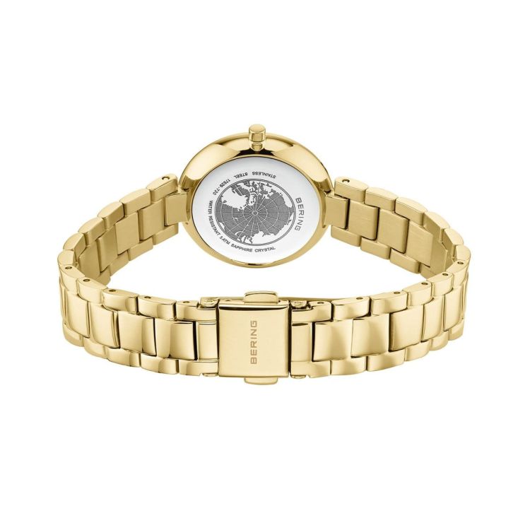 De BERING 17529-730 combineert de helderheid van Scandinavisch design met de schittering van luxueuze goudtinten. De zilverkleurige zonnestraalwijzerplaat is volledig zuiver gehouden, met uitzondering van een enkele sprankelende diamant op 12 uur - een elegant detail dat het horloge subtiele verfijning geeft.