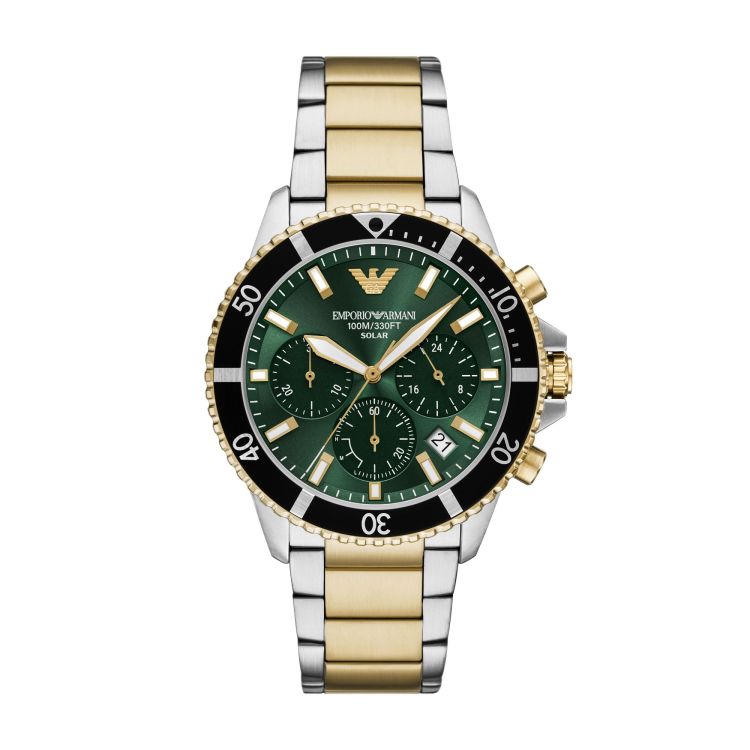 Dit 43,5 mm World Explorer-chronograafhorloge op zonne-energie heeft een groene zonnestraalwijzerplaat, saffierglas en een tweekleurige roestvrijstalen armband. Het uurwerk op zonne-energie zorgt voor betrouwbaarheid en elimineert de noodzaak om de batterij regelmatig te vervangen. Dit horloge kan tot 5 maanden meegaan op één volle lading.