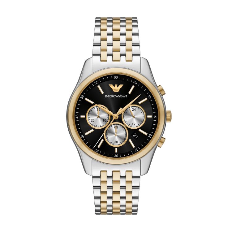 Dit horloge van 41 mm heeft een Zwart geëmailleerde wijzerplaat,  beschikt over een Quartz-chronograaf binnenwerk.  De kast en band is vervaardigd uit roestvrijstaal uitgevoerd in tweekleurig geelgouden PVD coting en heeft een mineraalglas.