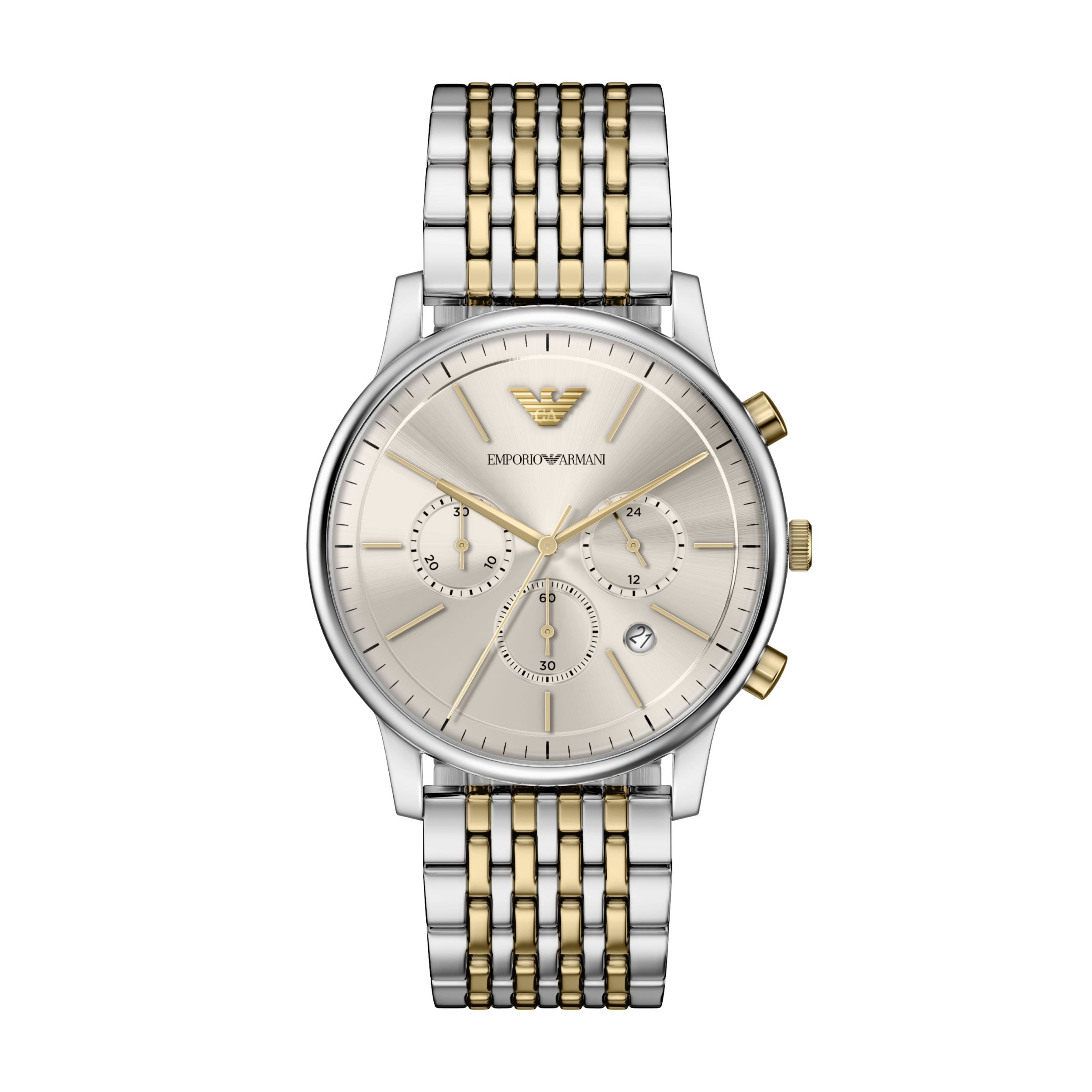 De 42mm chronograaf van Emporio Armani combineert precisie en modern ontwerp. Een zonnestraalwijzerplaat van eierschaal onder een koepelvormige kristal past moeiteloos bij een tweekleurige roestvrijstalen armband, terwijl een discreet datumvenster op 4 uur de drager perfect op tijd houdt met een Japans uurwerk.