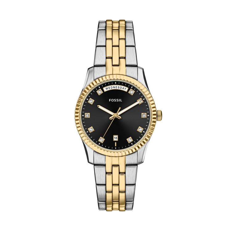 Een zwarte zonnestraalwijzerplaat verankert dit tweekleurige roestvrijstalen horloge, met dag- en datumdisplays voor extra functionaliteit. De ronde tweekleurige zilver- en goudkleurige hoes wordt gecombineerd met een tweekleurige zilver- en goudkleurige armband, wat zorgt voor een evenwichtig ontwerp dat zowel gepolijst als eigentijds aanvoelt. Een dubbel-gedrukte uitwerpgesp zorgt voor een veilige en comfortabele pasvorm.