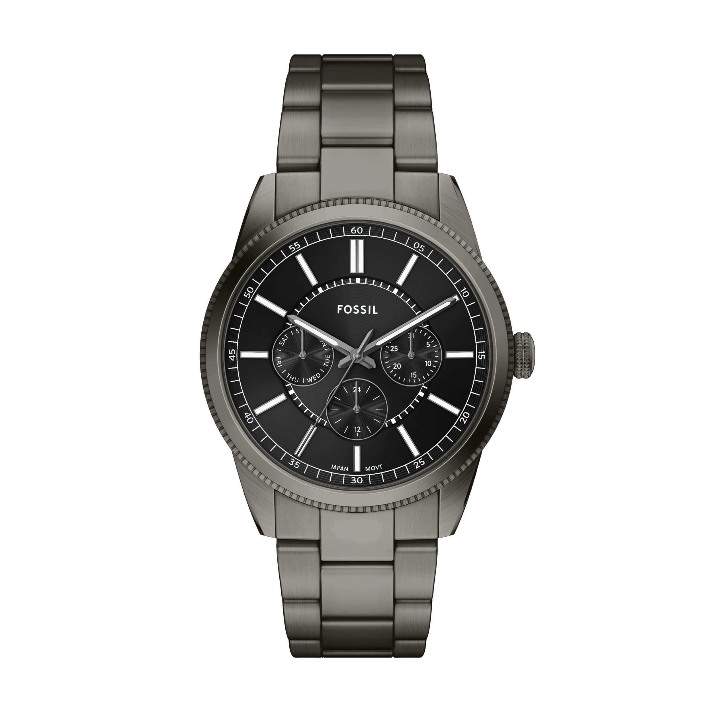 Een staalgrijze roestvrijstalen armband en kast zorgen voor een strakke, monochrome look in dit multifunctionele horloge. De zwarte wijzerplaat is voorzien van een sunray-afwerking voor extra diepte, aangevuld met praktische sub-wijzerplaten voor dag-, datum- en 24-uursfunctionaliteit. De ronde kast is met doordachte precisie ontworpen en past naadloos bij de minimalistische armband en zorgt voor strakke lijnen en veelzijdige styling.