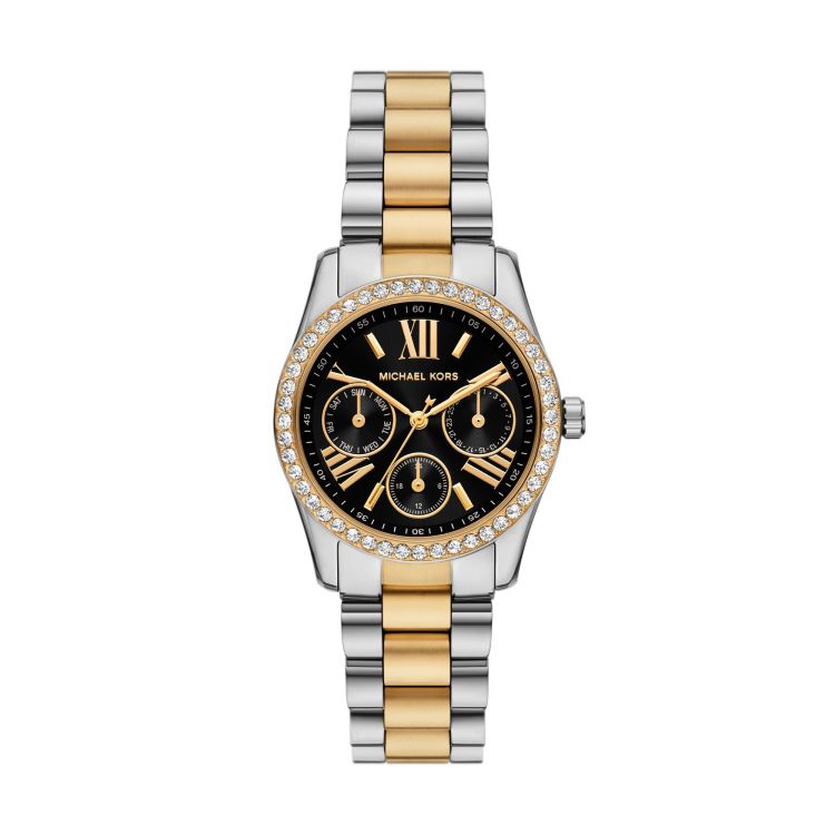 Het minihorloge Lexington verblindt met zijn sprankelende bezel met siersteentjes en elegante zwarte wijzerplaat met goudkleurige Romeinse cijfers. Dit horloge van tweekleurig roestvrij staal met een klassieke armband met drie rijen schakels voegt zowel overdag als 's avonds een vleugje glamour toe aan je looks.