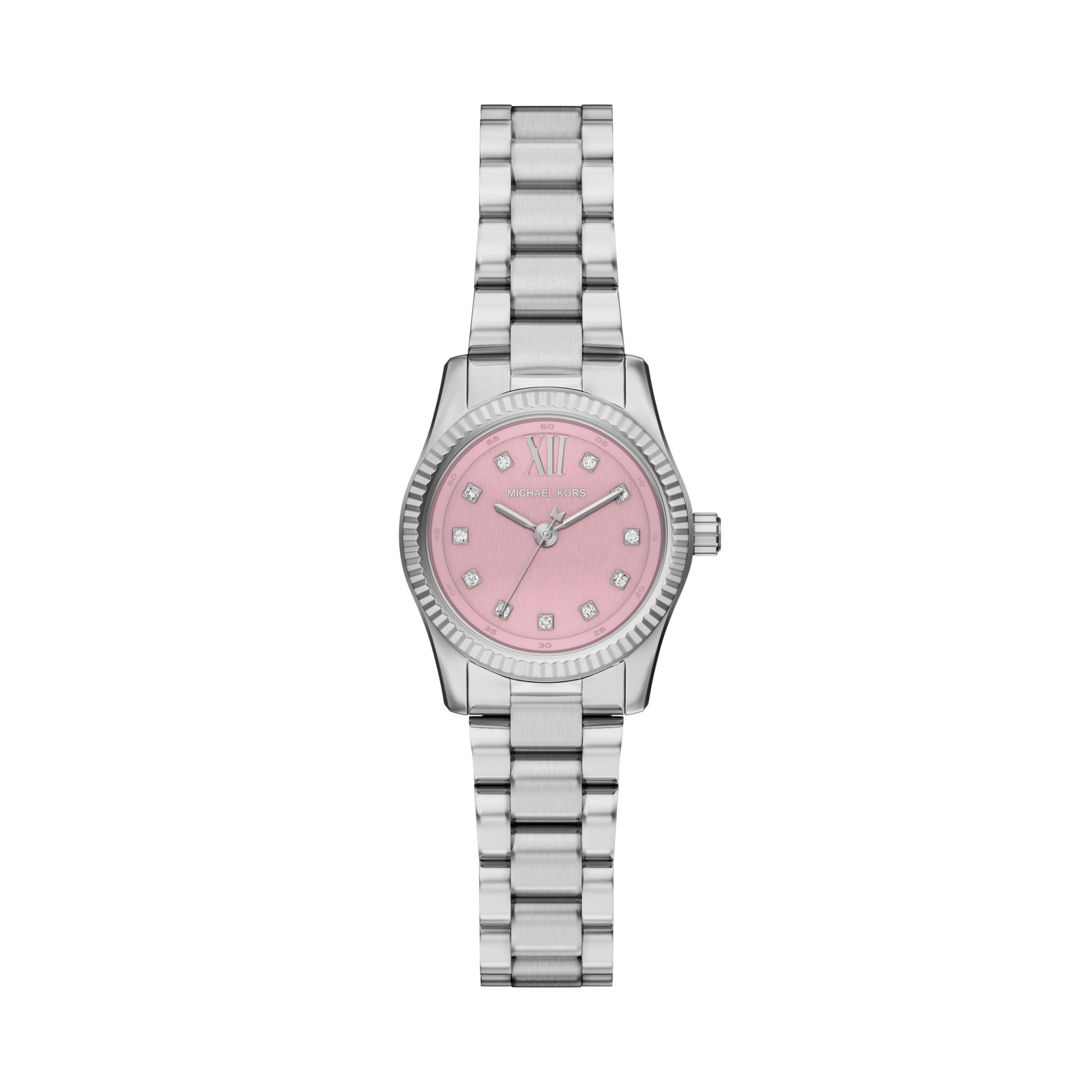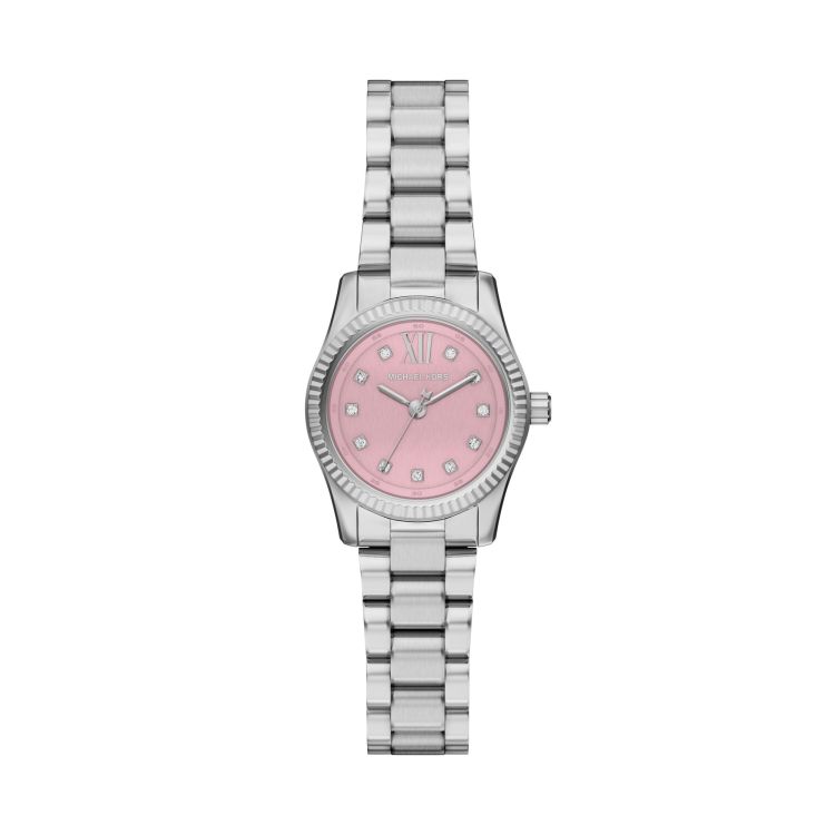 Het horloge Lexington straalt dagelijkse glamour uit dankzij de zilveren kleur en sprankelende siersteentjes op de uurmarkeringen. Dit mini-uurwerk is volledig gemaakt van roestvrij staal en heeft een roze parelmoeren wijzerplaat met een afgeschuinde ring aan de bovenkant en een bijpassende armband. Het geeft je looks overdag én 's avonds een verfijnde charme.
