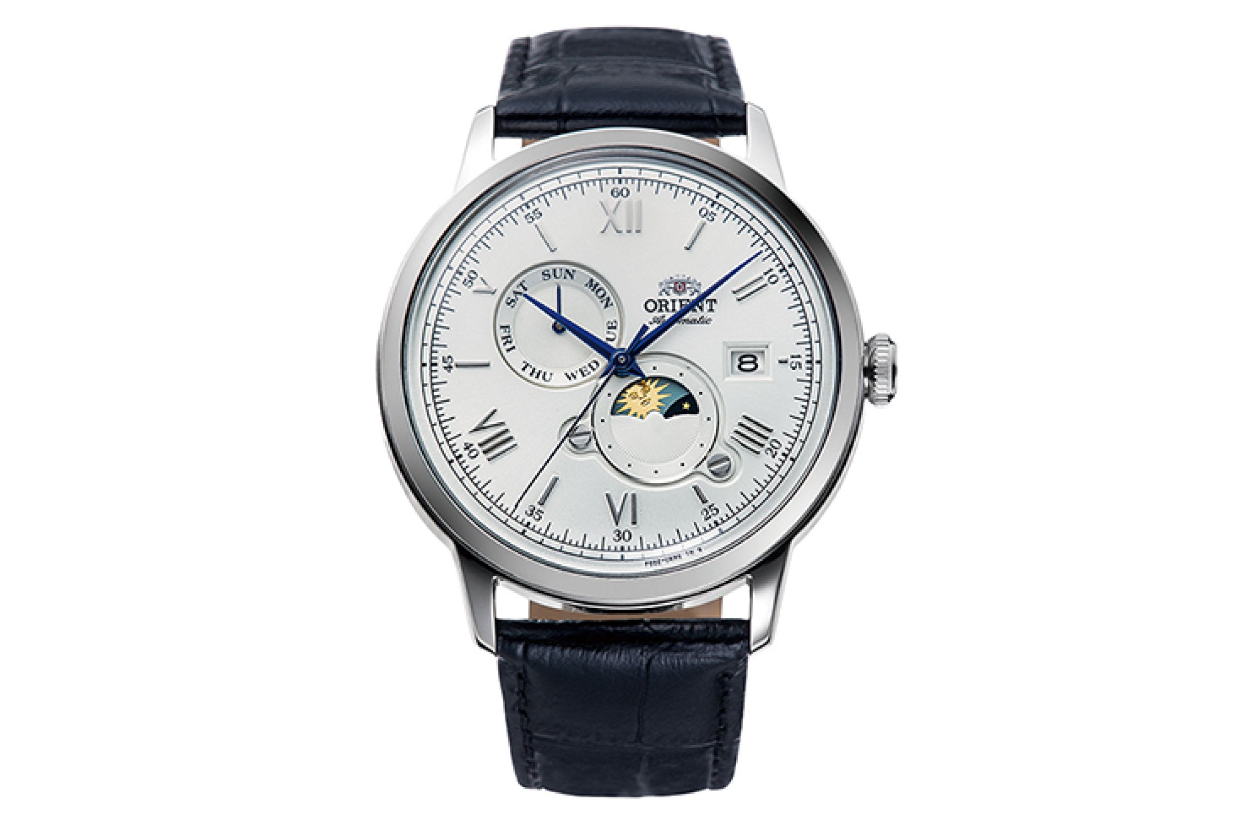 De asymmetrie van de dag- en nachtweergave met zon- en maanontwerp op 4 uur en dagwijzer op 10 uur geeft een unieke uitstraling aan de wijzerplaat.