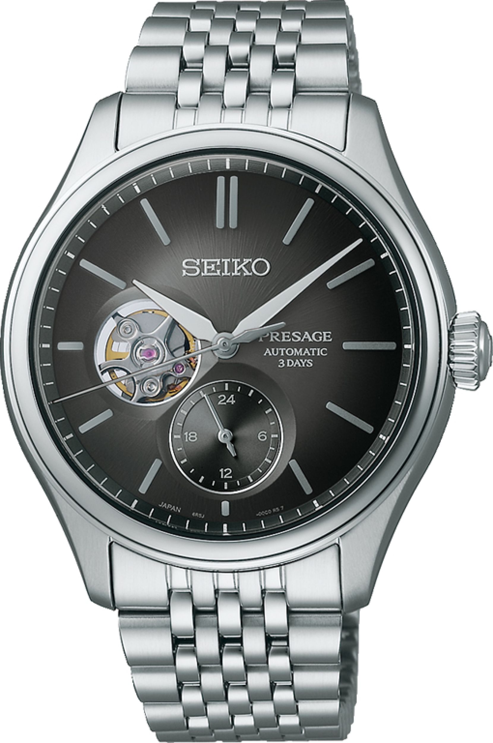 De gebogen wijzerplaat is kenmerkend voor de Seiko Presage Classic Serie. De wijzerplaat is afgewerkt met een rijke textuur die de zachtheid en souplesse uitdrukken van natuurlijk textiel, waarvan het gebruik verweven is met de Japanse cultuur. Het open hart uurwerkvenster beeld met een radiaal patroon de textuur uit van ruw zijdegaren.