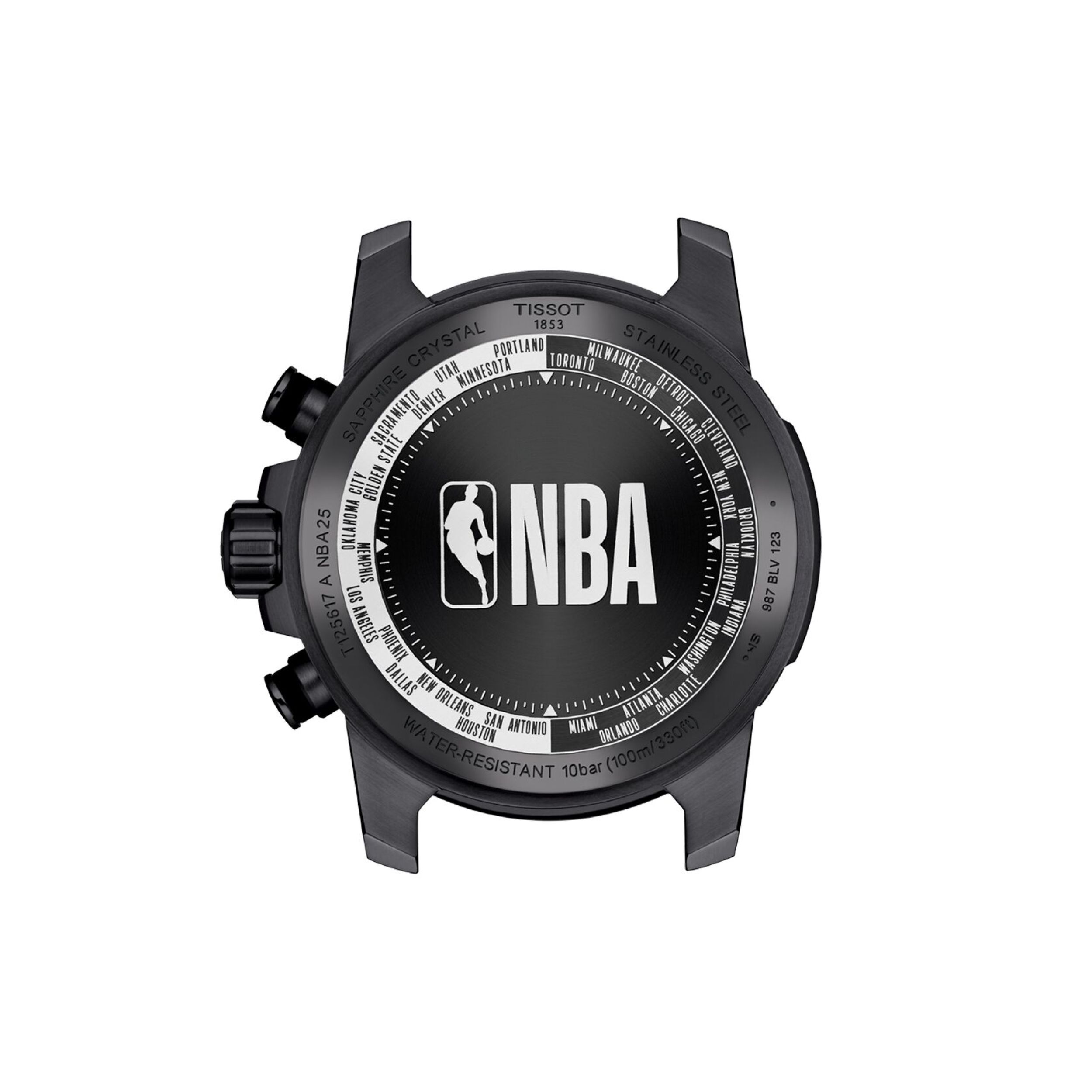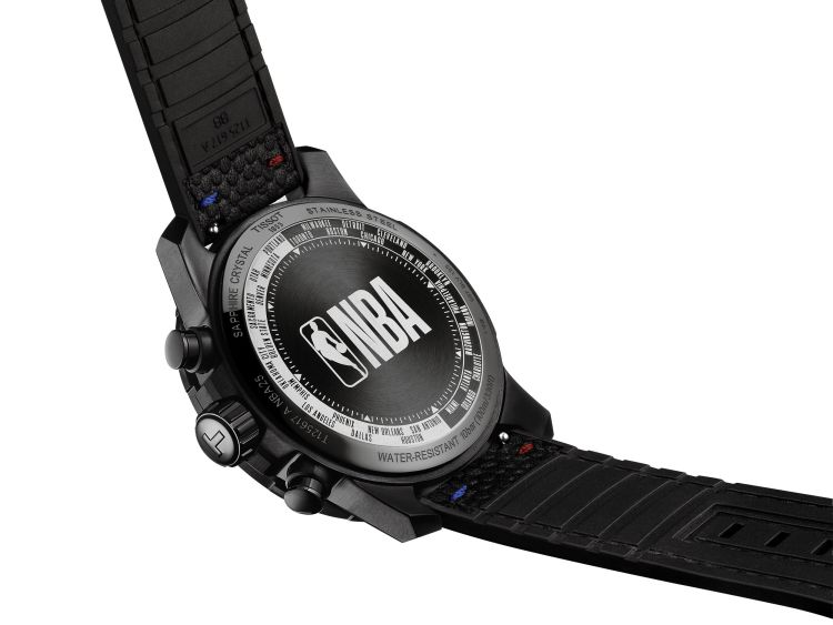 De zwarte band van twee materialen complementeert de textuur van de wijzerplaat, waardoor deze perfect is voor dagelijks gebruik en fysieke activiteiten. De achterkant van de kast herbergt een ware verborgen parel: gedetailleerde gravures van het NBA-logo, omringd door de steden en staten waar de teams hun naam aan ontlenen, zowel de Western als de Eastern Conference.