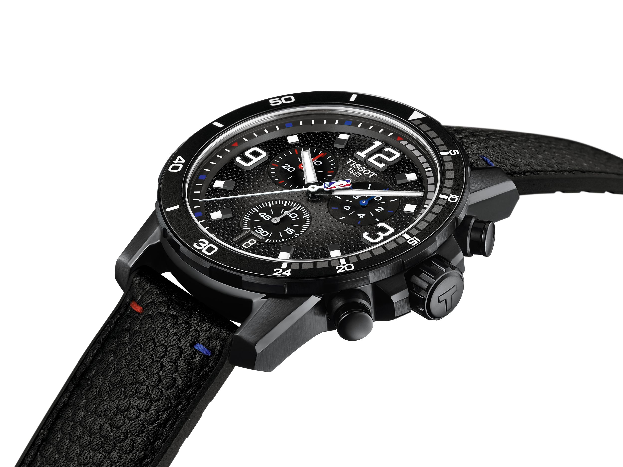 De NBA Supersport Special Edition eert basketbal met doordachte details en een sportieve stijl. De opvallende 45 mm zwarte PVD-gecoate roestvrijstalen kast is voorzien van een lunette met de 24-secondenregel, gebaseerd op de schotklok van de NBA, met kleuraccenten die verwijzen naar de competitie. De wijzerplaat, met een basketbalstippenpatroon en een verloop van donkergrijs naar zwart aan de randen, creëert een illusie van diepte die de vorm van de bal weerspiegelt. Cijferaanduidingen, zoals die op het shirt van de speler, voegen een betekenisvolle touch toe, terwijl het NBA-logo op de secondewijzer een extra eerbetoon aan de sport vormt.