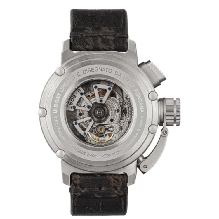 gemaakt van AISI 316L staal. De sluiting tussen de gepolijste wolfraambezel en de achterkant van de kast wordt bereikt door externe nokken die aan de achterkant van de kast zijn gekoppeld. Speciaal type nokschroeven met aangepaste sleutel. Grote geschroefde kroonafdekking voor maximale waterbestendigheid. 46 mm doorsnede.