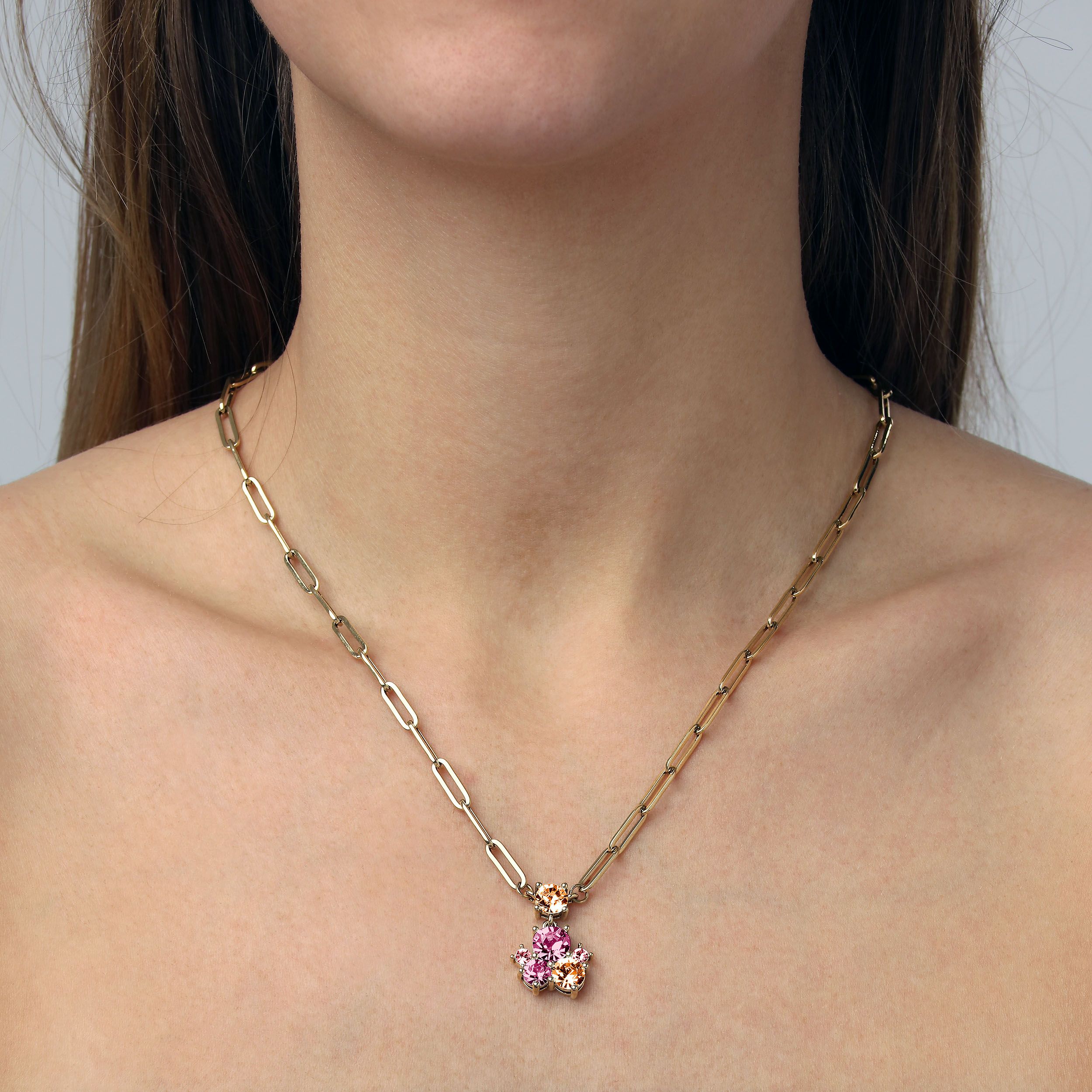 TANZY is een elegante halsketting waarbij de hanger een veelvoudig kristal van verschillende maten bevat. Totale lengte ongeveer 45 cm en 5 cm verlenging. Ketting gemaakt van roestvrij staal, hangers van gepolijst messing. Hier afgebeeld in een goudtint met rozenkristallen. Nikkelvrij Deens ontwerp.