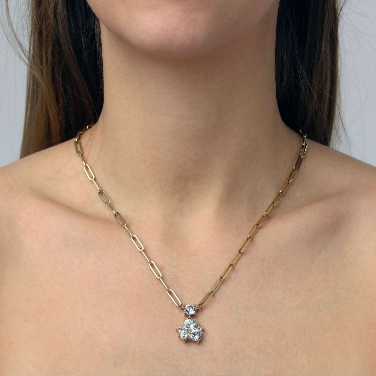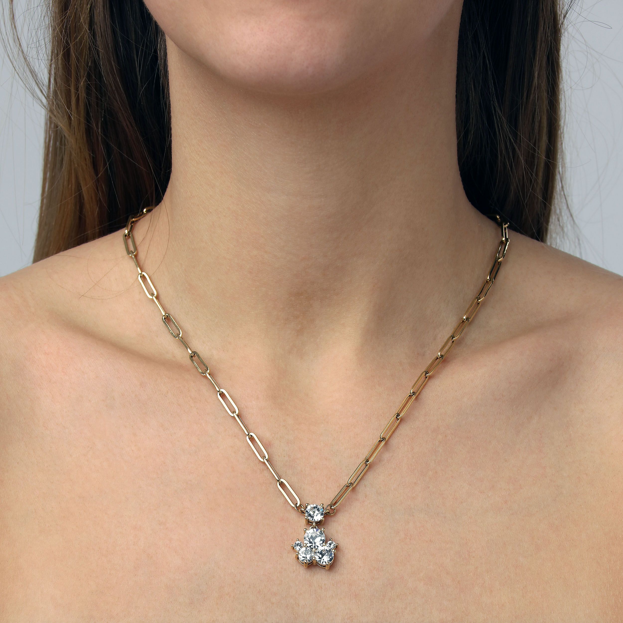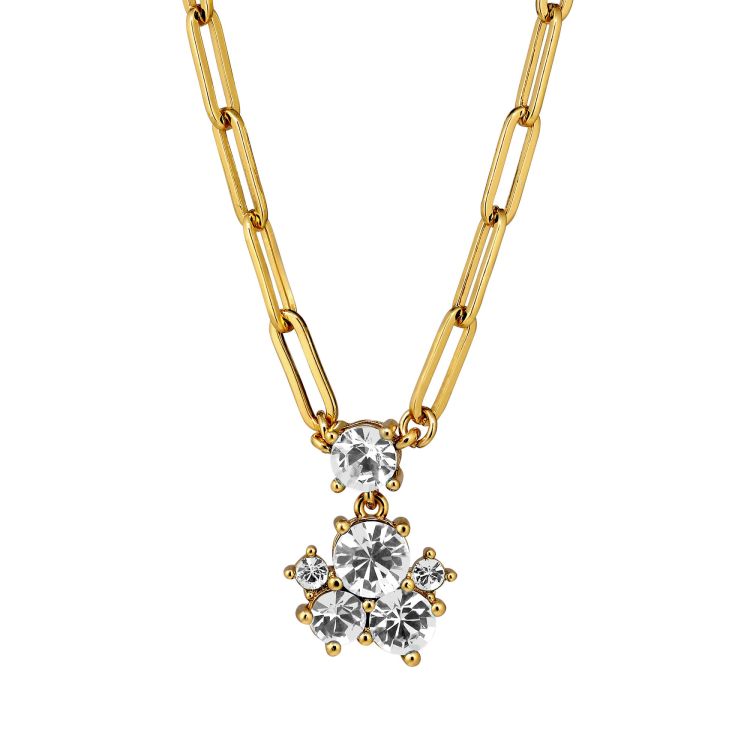 TANZY is een elegante halsketting waarbij de hanger een veelvoudig kristal van verschillende maten bevat. Totale lengte ongeveer 45 cm en 5 cm verlenging. Ketting gemaakt van roestvrij staal, hangers van gepolijst messing. Hier weergegeven in goudtint met witte kristallen. Nikkelvrij Deens ontwerp.
