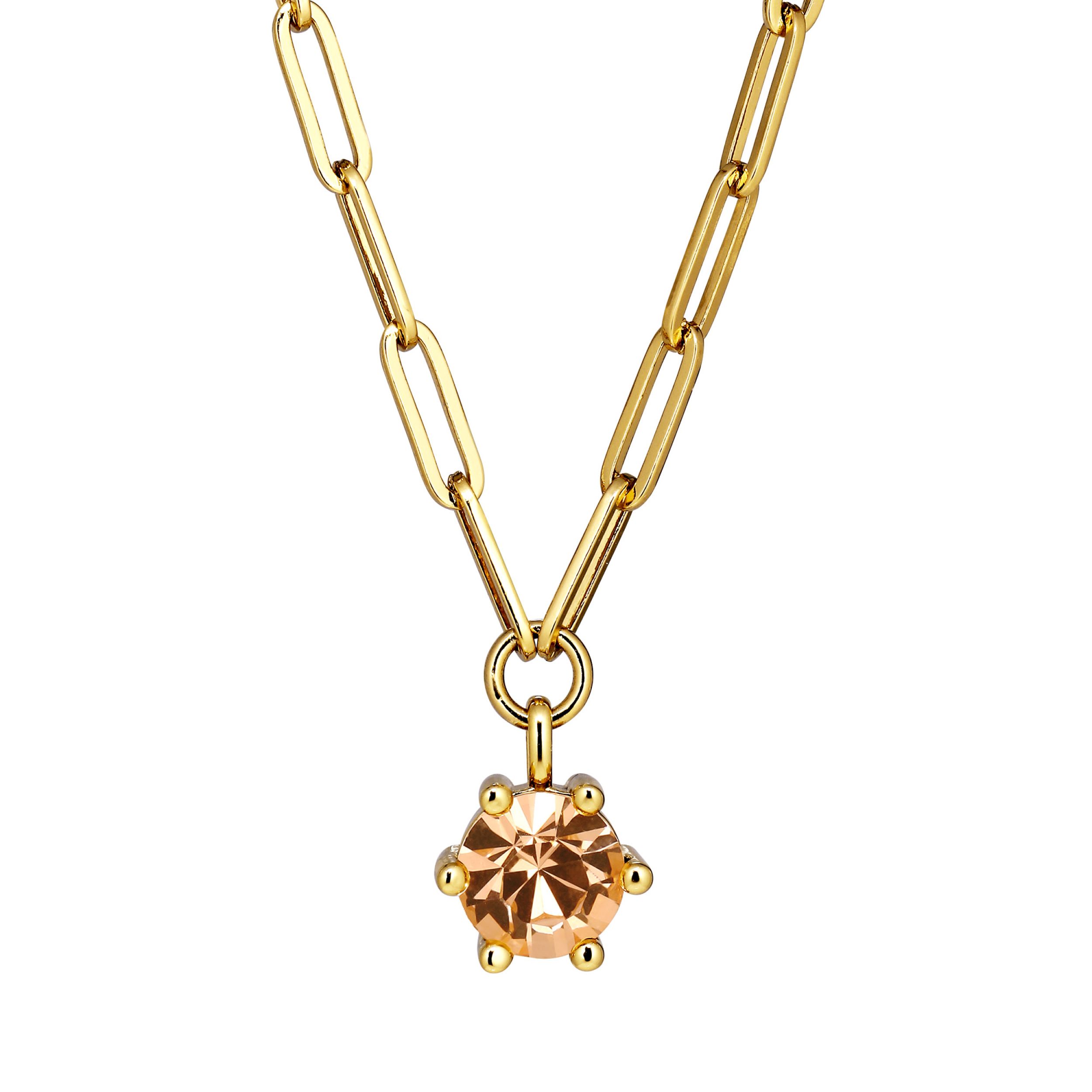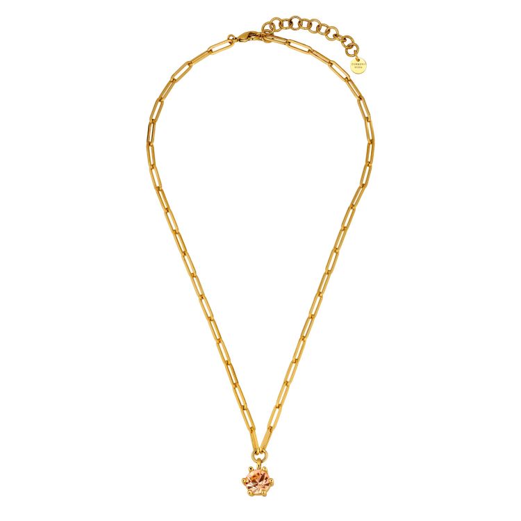 JESSA is een coole en stevige ketting met korte hals in een gekoppeld ontwerp. De solitaire hanger heeft een grote fonkelende, gefacetteerde gouden perzikkristal in een klassieke klauwzetting. Ketting en hanger gemaakt van messing. Hier getoond in glanzende goudkleurige afwerking. Totale lengte 42 cm + verlenging. DEENS ONTWERP - vrij van cadmium, lood en nikkel.