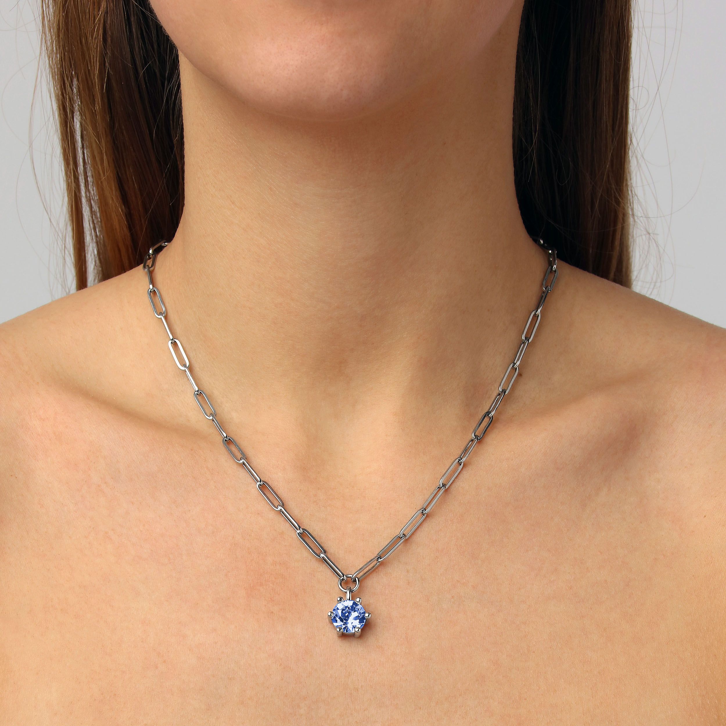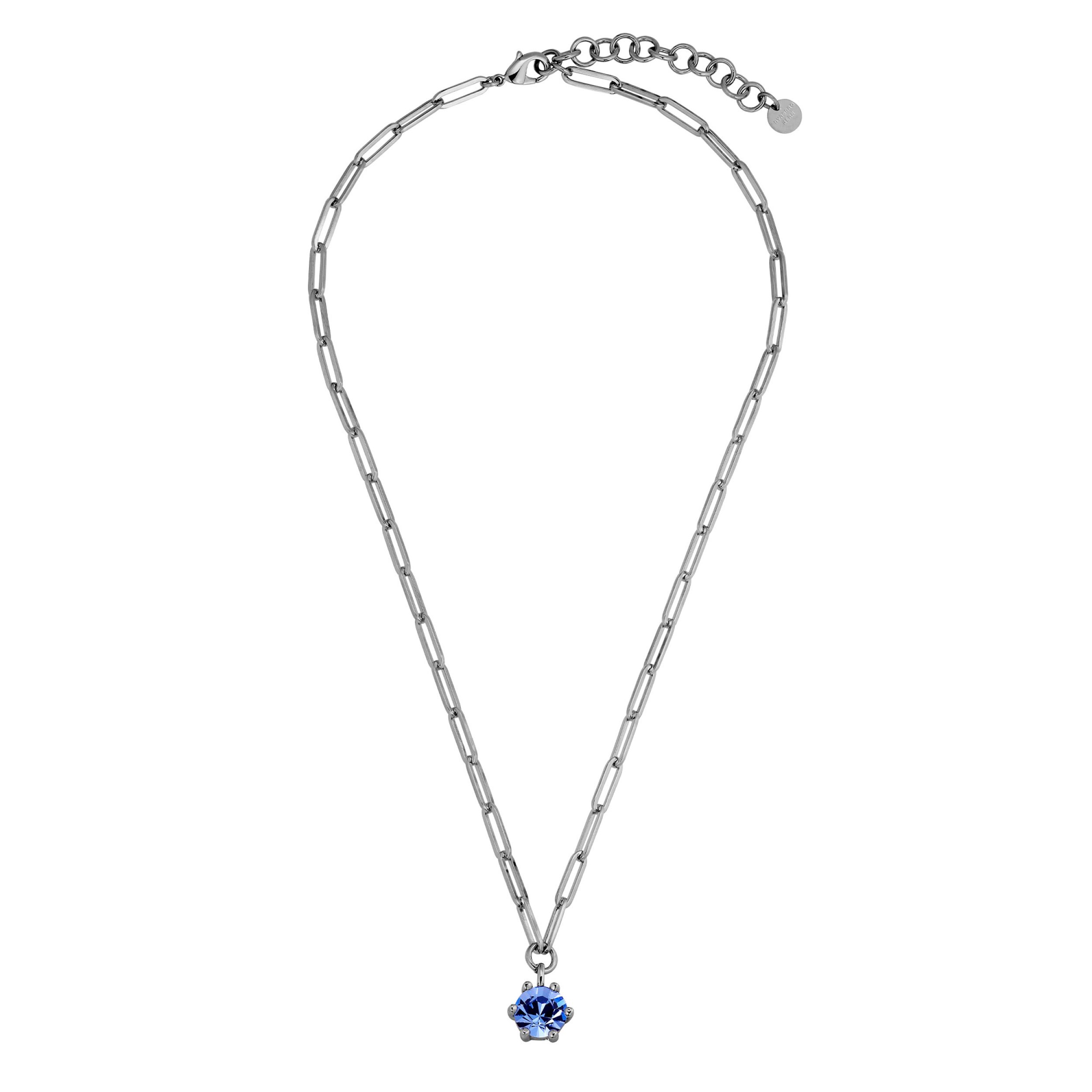 JESSA is een coole en stevige ketting met korte hals in een gekoppeld ontwerp. De solitaire hanger heeft een grote fonkelende facetteerde lichtblauwe kristal in een klassieke klauwzetting. Ketting en hanger gemaakt van messing. Hier weergegeven in glanzende zilverkleurige afwerking. Totale lengte 42 cm + verlenging. DEENS ONTWERP - vrij van cadmium, lood en nikkel.