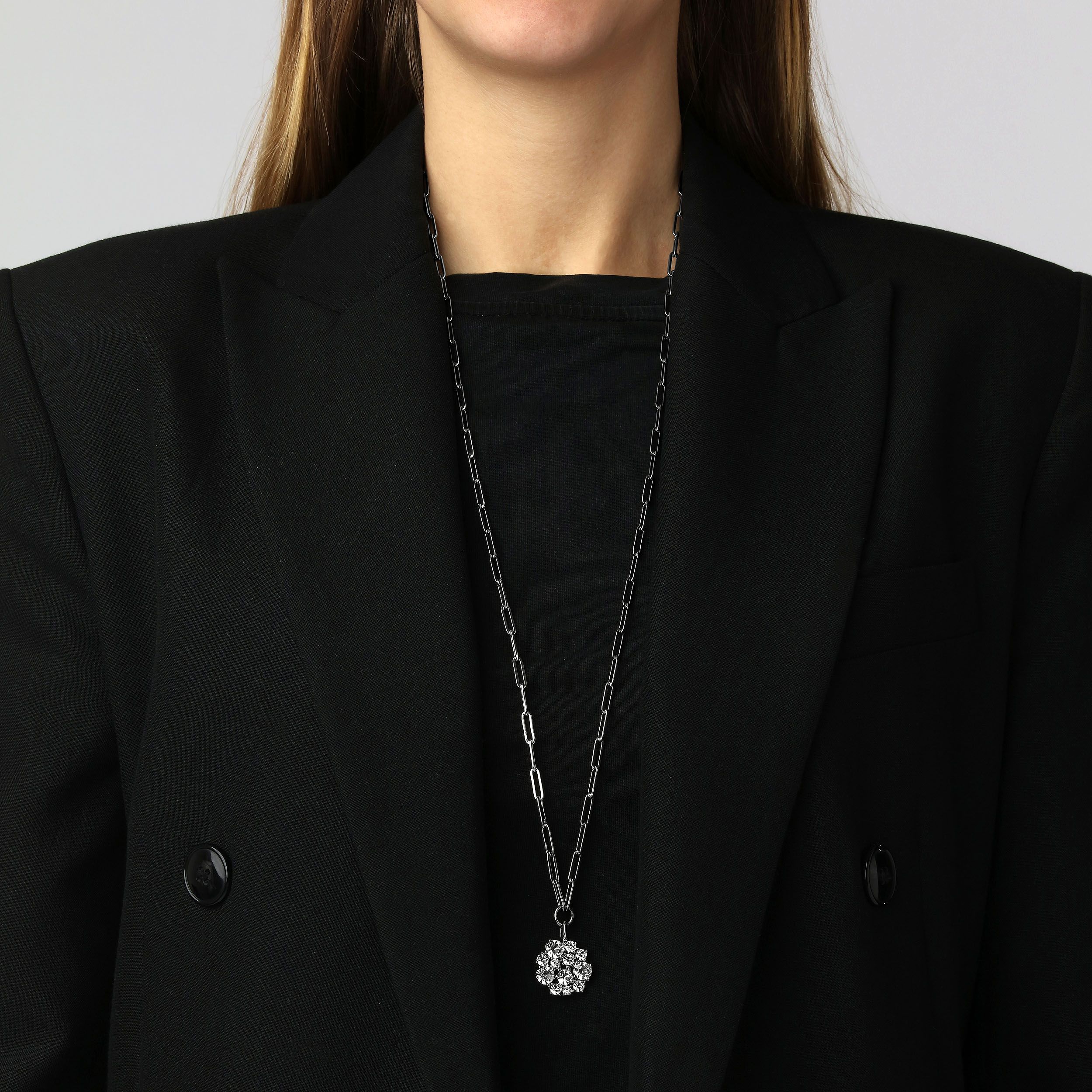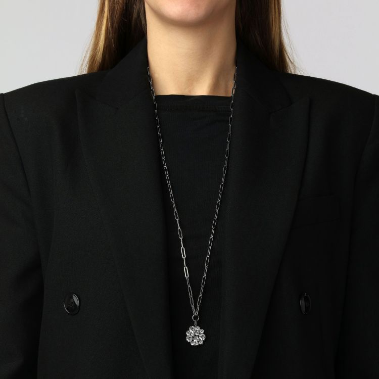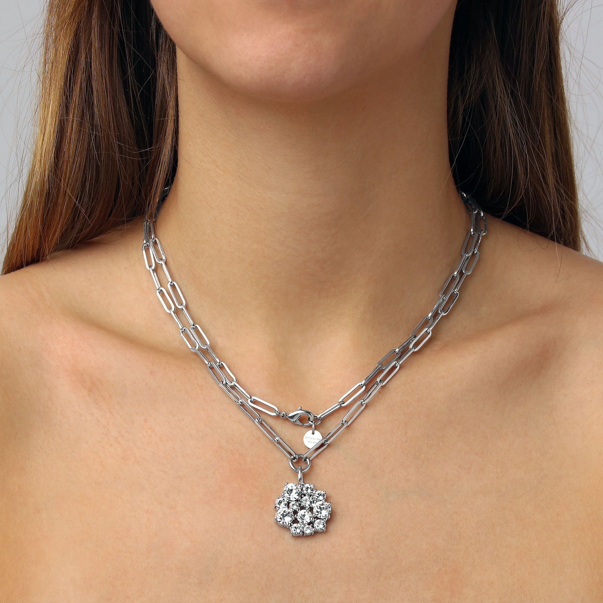 COLT - is een elegante en ongebruikelijke hangerketting. De hanger is ontworpen met meervoudig kleinere en grotere ronde facetgesneden kristallen chatons, asymmetrisch geplaatst in een rond patroon. Echt een opmerkelijk ontwerp. Totale lengte 80 cm. De carrosserie is gemaakt van gepolijst messing - ketting ontworpen in roestvrij chirurgisch staal. Hier weergegeven in witte kristallen en zilverkleurige afwerking. DEENS ONTWERP - vrij van cadmium, lood en nikkel.