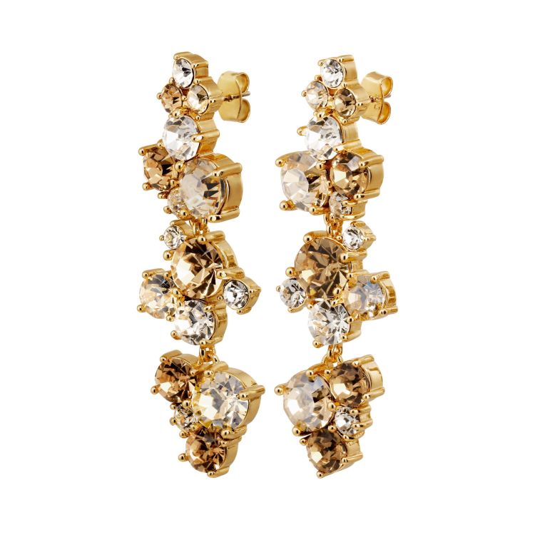 MAYHEM - een elegante en ongebruikelijke oorbel van een stud na het feest, ontworpen met meerdere keren van kleinere en grotere ronde facetgesneden kristallen chatons, geplaatst in een asymmetrisch "chaotisch" patroon. Een ongebruikelijk en extravagant ontwerp. Het midden en de onderste delen bewegen. Totale lengte ongeveer 50 mm. Hier wordt in xx getoond een mix van warme gouden tinten met een gouden afwerking. DEENS ONTWERP - vrij van cadmium, lood en nikkel.
