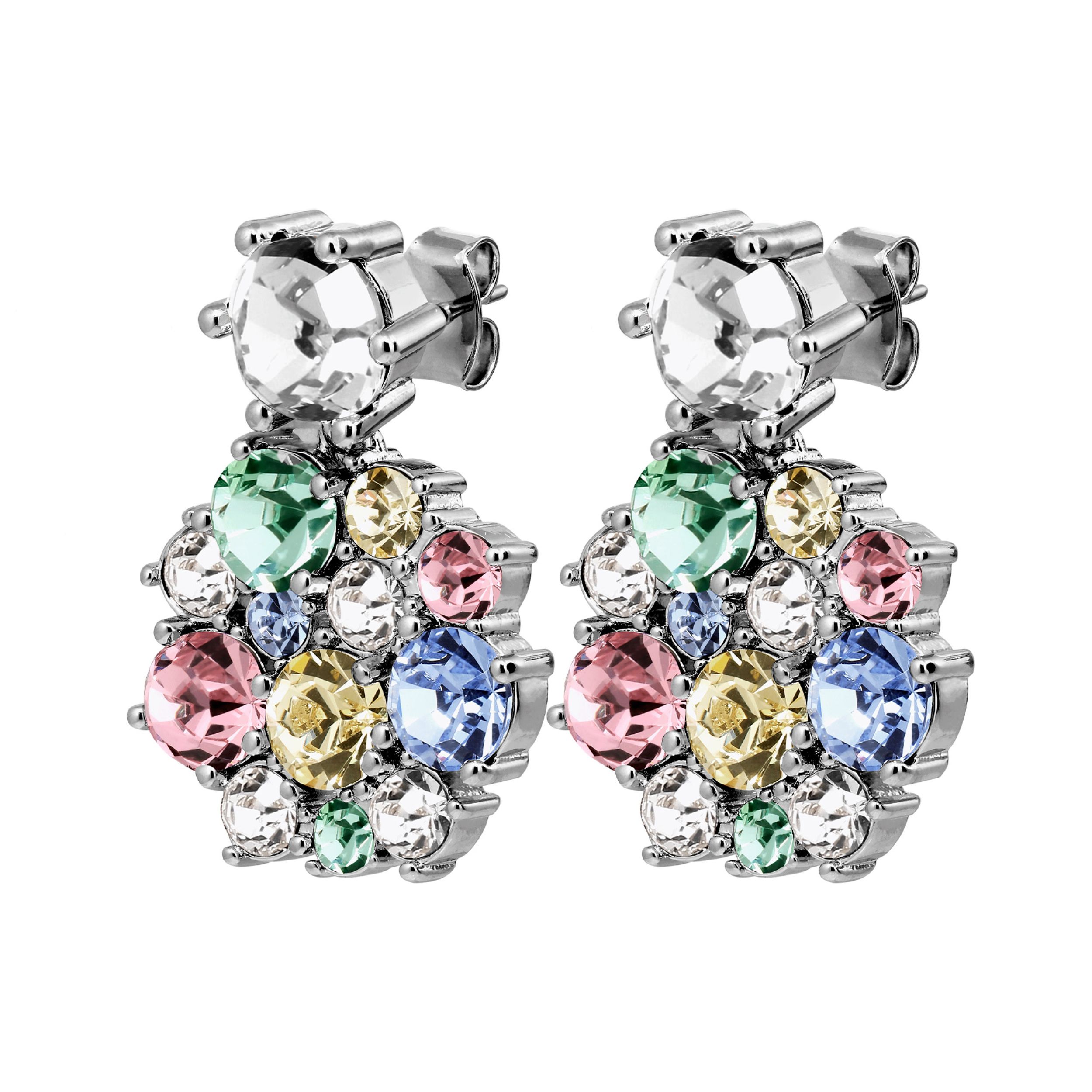 FREESIA - is een elegante en ongebruikelijke stud na een feest oorbel, ontworpen met meerdere keren van kleinere en grotere ronde facetten geslepen kristallen chatons, asymmetrisch geplaatst in een rond patroon. Echt een opmerkelijk ontwerp. Het onderste deel beweegt. Totale lengte 40 mm. Lichaam gemaakt van gepolijst messing - stijlpen ontworpen in roestvrij chirurgisch staal. Hier weergegeven in gemengde pastelkleuren en zilvertinten. DEENS ONTWERP - vrij van cadmium, lood en nikkel.