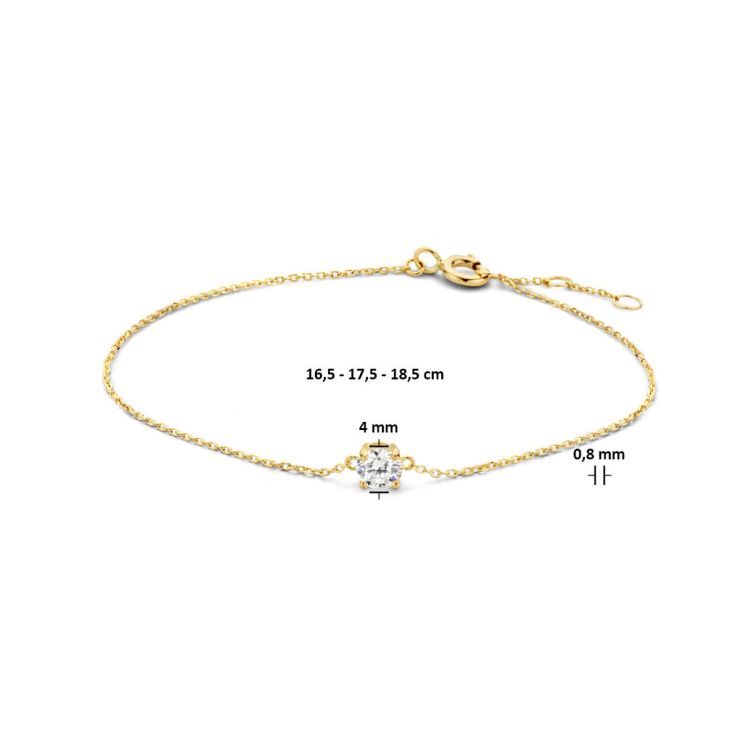 14k Geelgouden anker armband uitgevoerd met een schitterende zirkonia. Deze armband met draaglengtes van 16.5, 17.5 en 18.5cm past bij iedere outfit en is met veel andere sieraden te combineren. De steen heeft een diameter van 4mm.