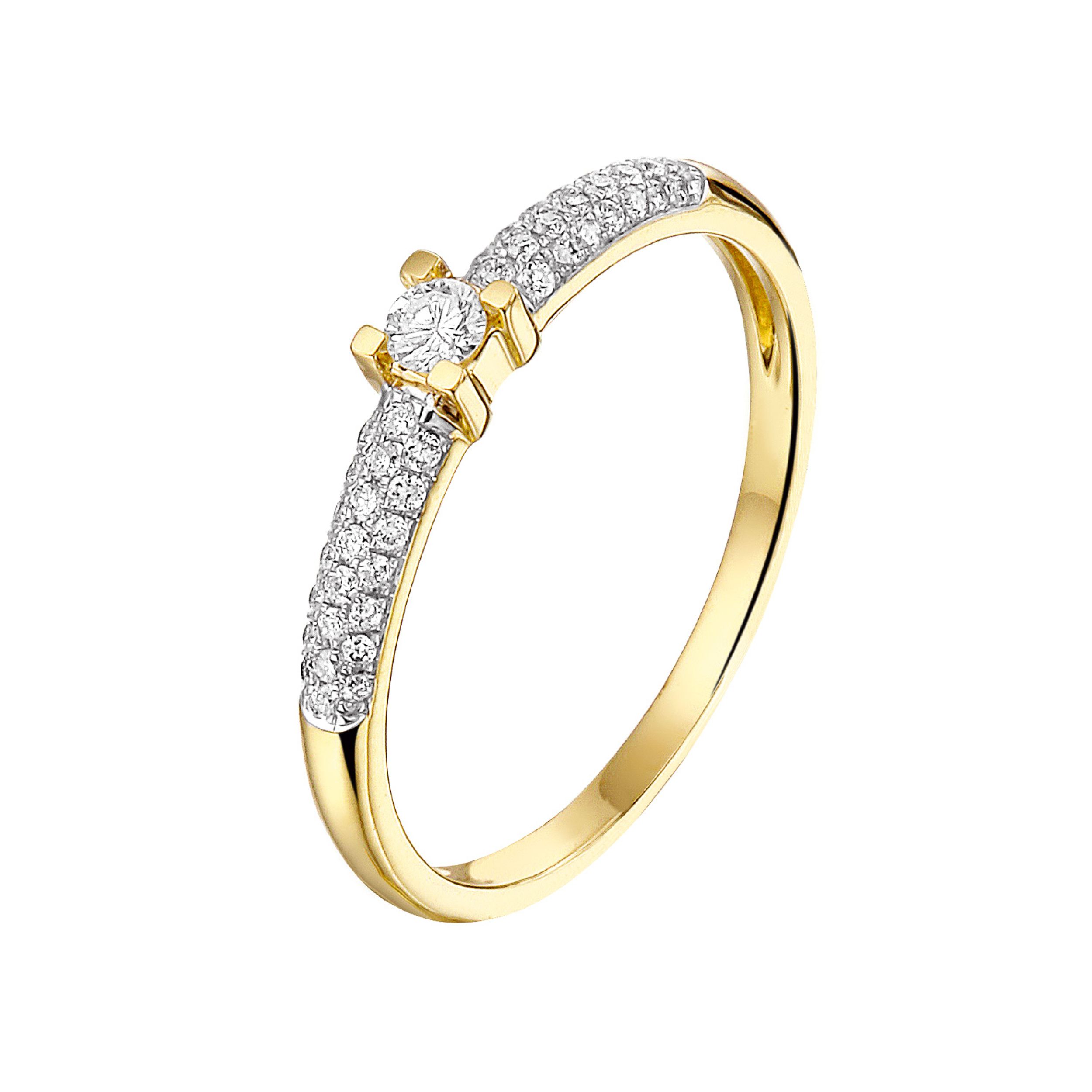 Wij staan voor kwaliteit en werken alleen met 14 & 18 karaats goud en diamant. Solitair Ring met Pavé Zijstenen 0.07 Crt Middensteen