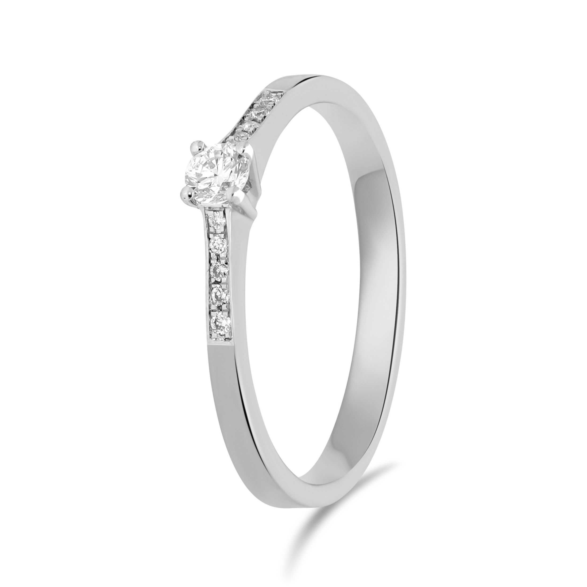Wij staan voor kwaliteit en werken alleen met 14 & 18 karaats goud en diamant. Solitairring met Zijstenen 1-0.12/10-0.05 Crt H SI, 14 Krt Witgoud.