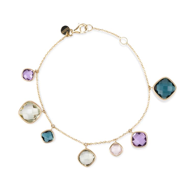 De 14 karaatse delicatesse van geelgoud versmelt met de edelstenen, waardoor een perfecte balans ontstaat. De natuurstenen creëren een regenboog van kleuren en unieke tinten.