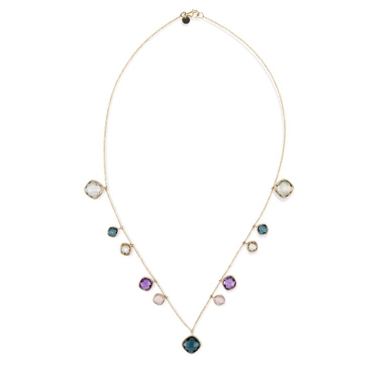De 14 karaatse delicatesse van geelgoud versmelt met de edelstenen, waardoor een perfecte balans ontstaat. De natuurstenen creëren een regenboog van kleuren en unieke tinten.