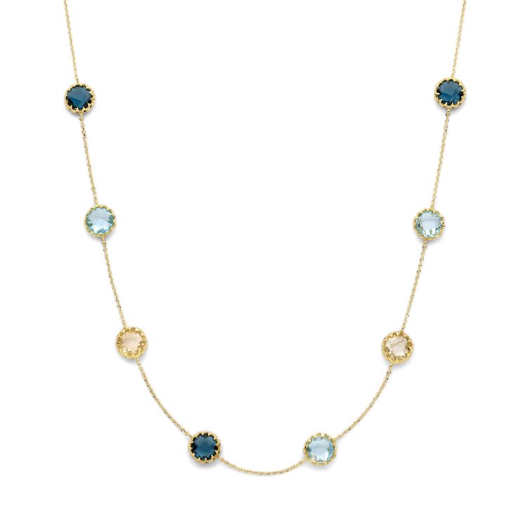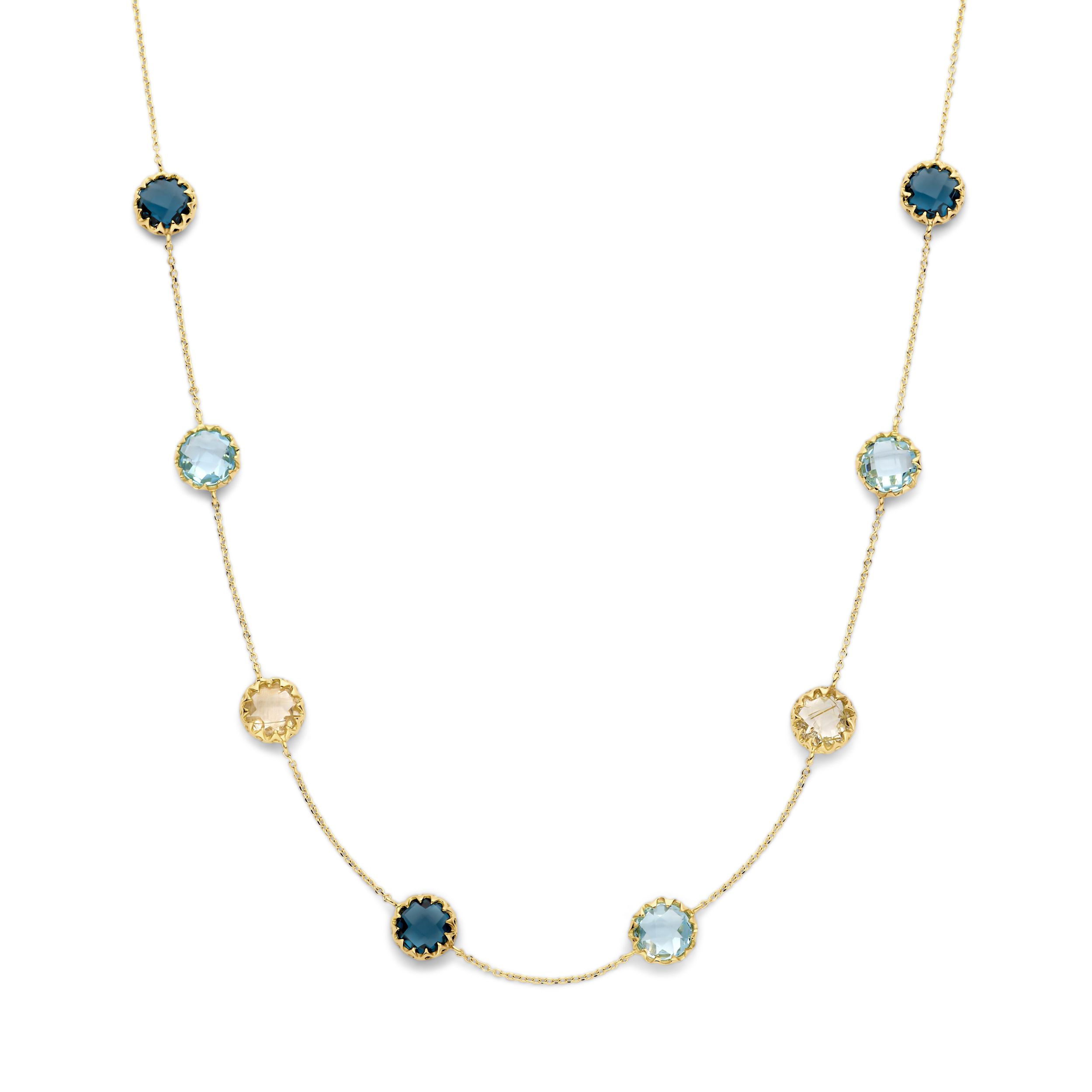 De 14 karaatse delicatesse van geelgoud versmelt met de edelstenen, waardoor een perfecte balans ontstaat. De natuurstenen creëren een regenboog van kleuren en unieke tinten.