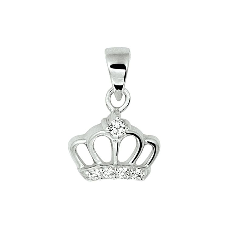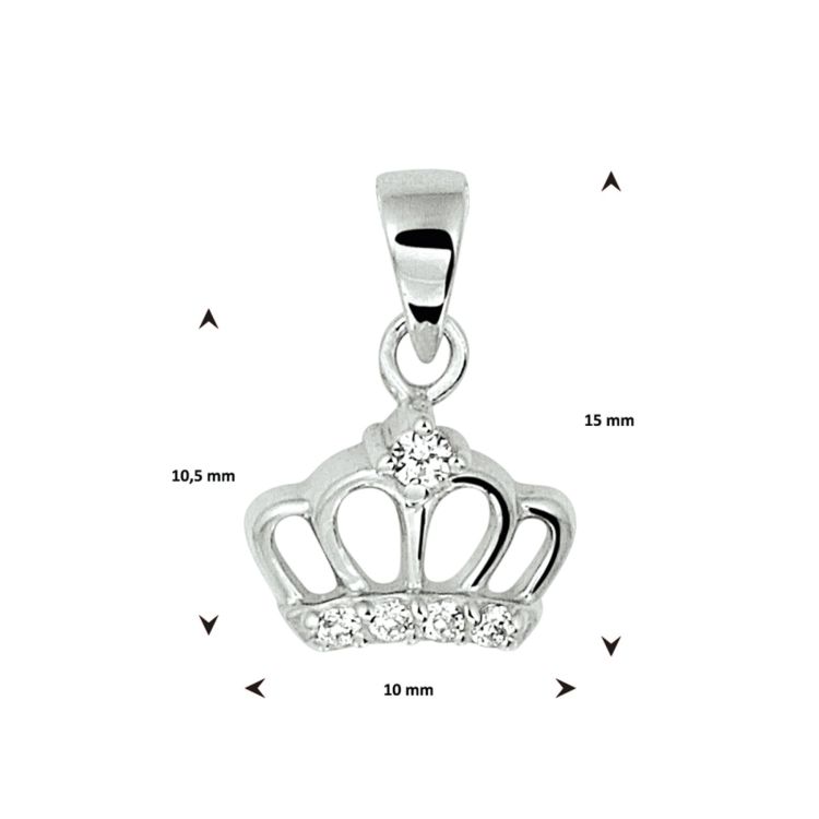 Schattige gerhodineerd zilveren hanger in de vorm van een kroontje met een afmeting van 15x10mm. Uitgevoerd met schitterende zirkonia en een stevige poussette sluiting. Deze hanger is perfect te combineren met bijpassende sieraden uit onze collectie. Tip: Leuk om kado te geven! Info: Gerhodineerd zilver is door de rhodiumlaag beter bestand tegen verkleuren en krassen.