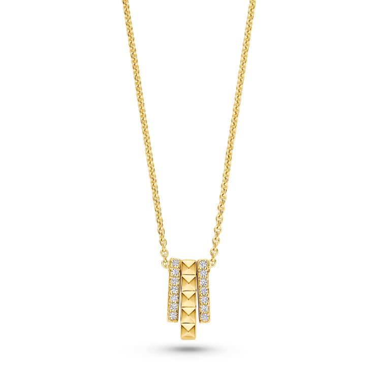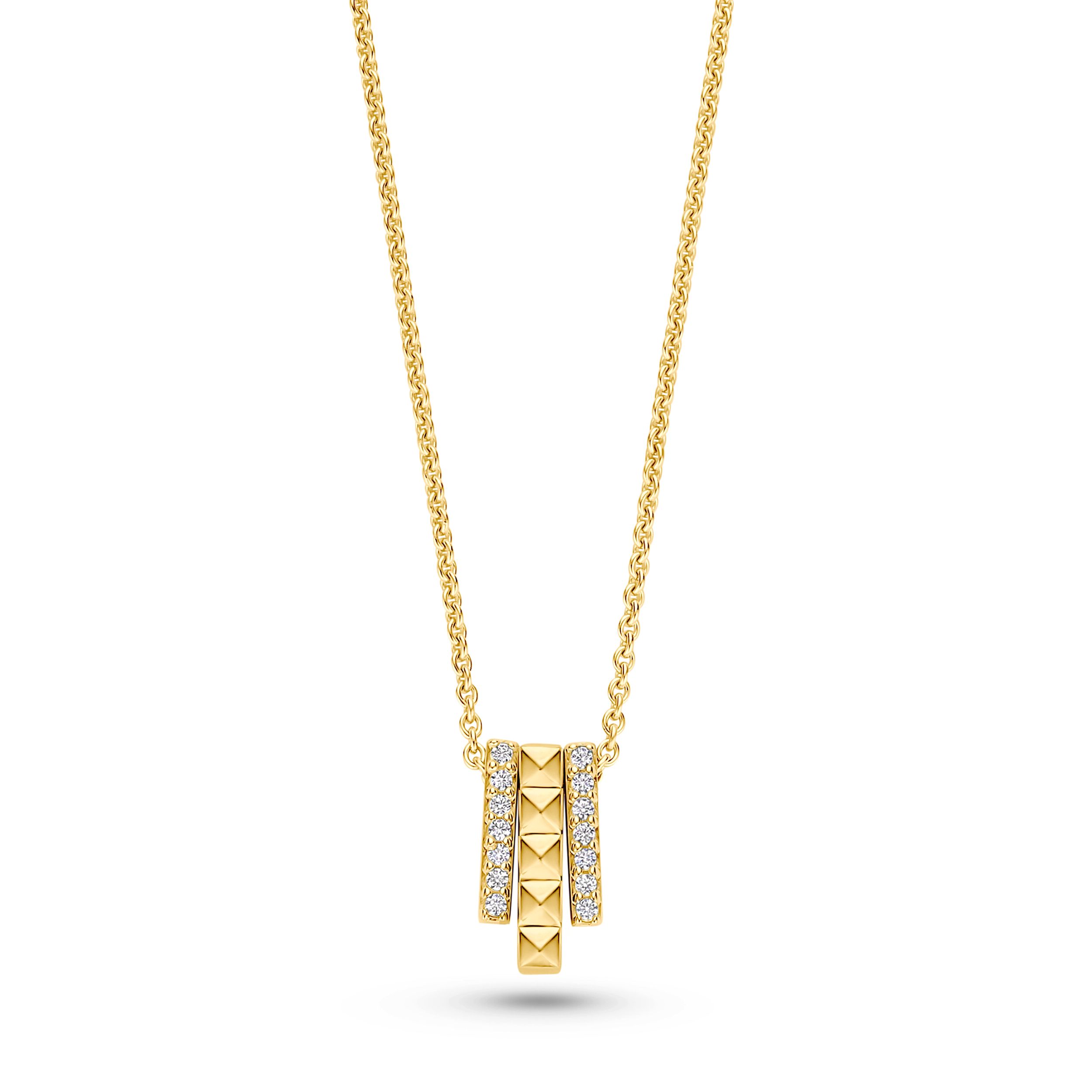 De moderne hanger, gemaakt van hoogwaardige, rhodiumgeplateerde sterling zilver, combineert heldere piramide-elementen met fonkelend zirkonia. Twee smalle, fonkelende zuilen omlijsten de krachtige centrale as – een ontwerp dat beweging, ontwikkeling en je eigen pad symboliseert.