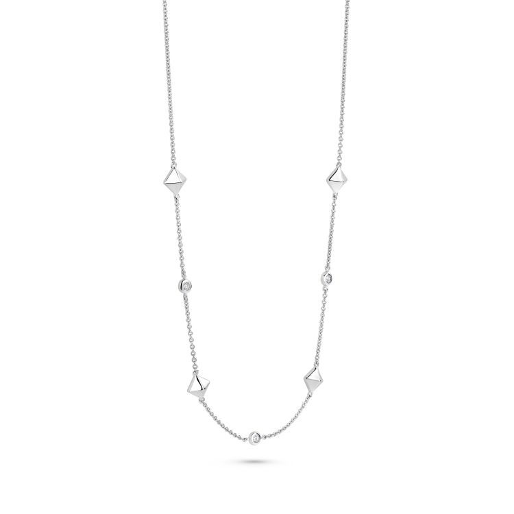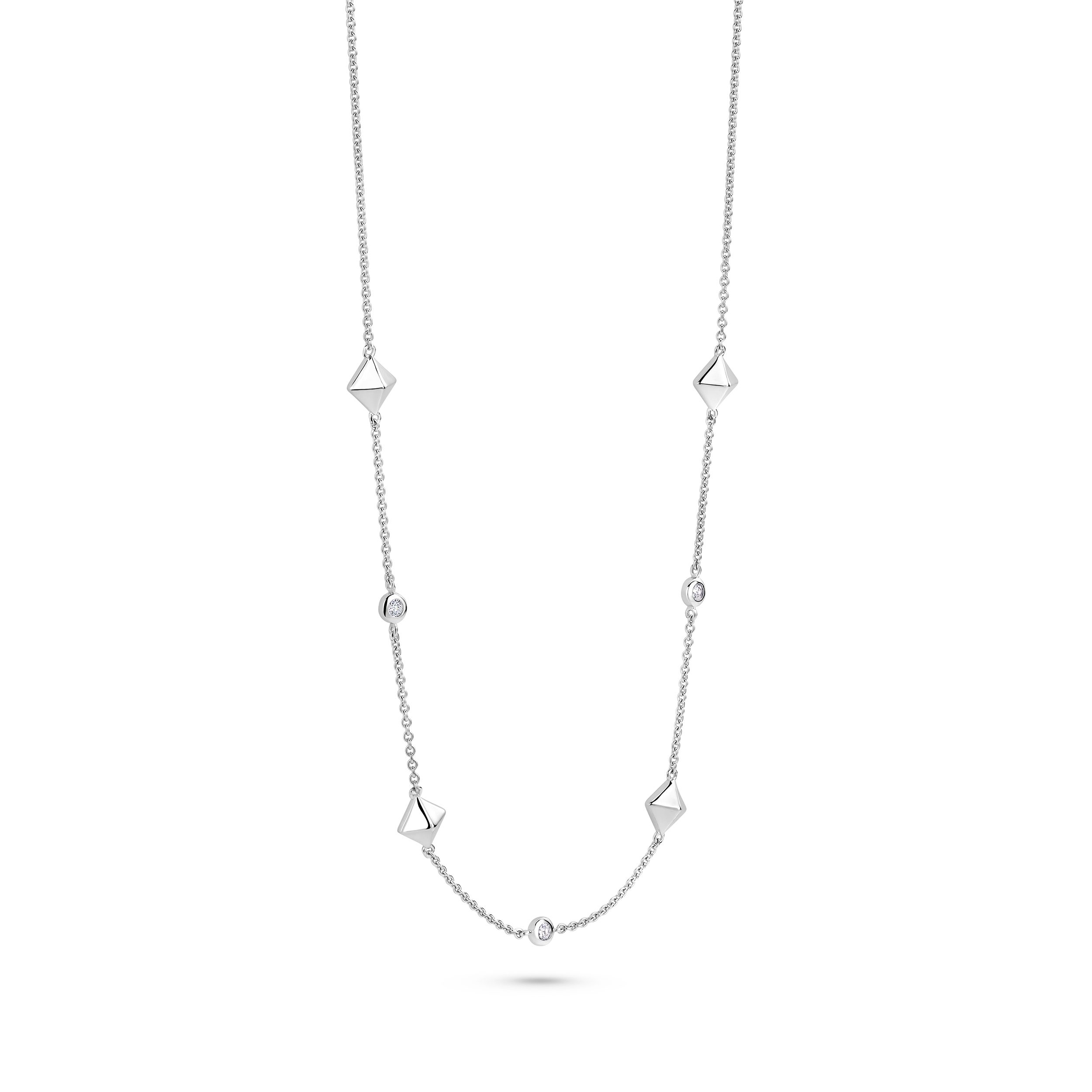 Fijne piramideelementen van hoogwaardige sterling zilver wisselen harmonieus af met fonkelend zirkonia en creëren een ontwerp dat duidelijke lijnen combineert met vrouwelijke elegantie. Deze ketting wikkelt zich zachtjes om je nek en begeleidt je de dag door – als een stil maar krachtig symbool van je pad, je dromen en je straling.