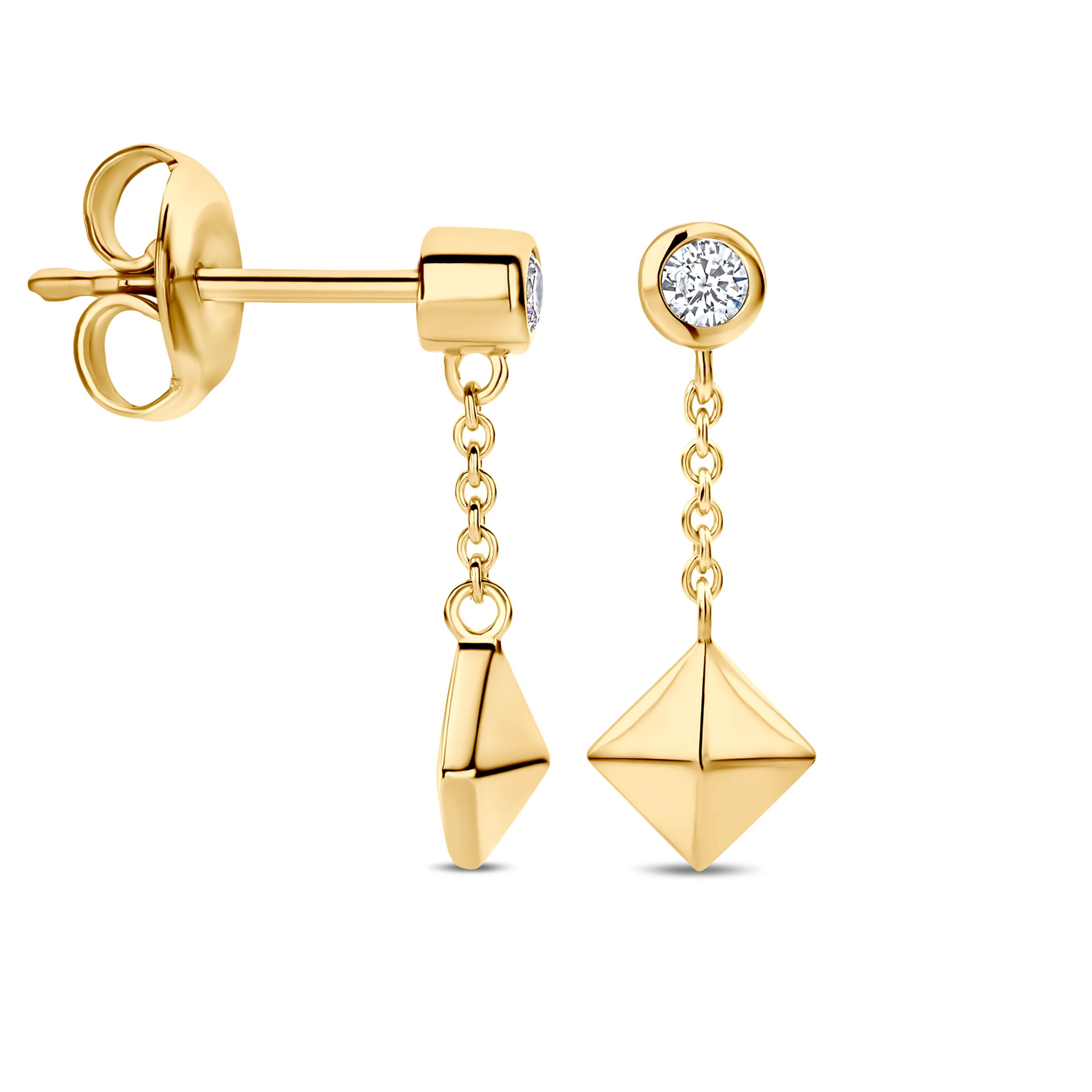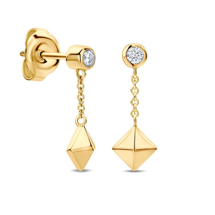 De vergulde piramide-elementen staan voor assertiviteit, een duidelijke houding en de kracht om je eigen weg te gaan. Een fonkelende zirkonia vormt het lichtgevende prelude en geeft de oorbellen een nobele, vrouwelijke accent.