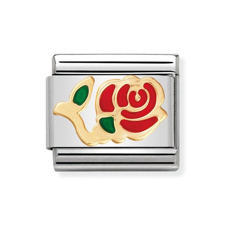 Originele roestvrijstalen bedel voor Nomination's Composable Classic Armband met details in geelgoud en email. Bloemsymbolen. Gemaakt in Italië. Rode rozen worden geassocieerd met schoonheid en zijn de perfecte manier om "Ik hou van je" te zeggen.