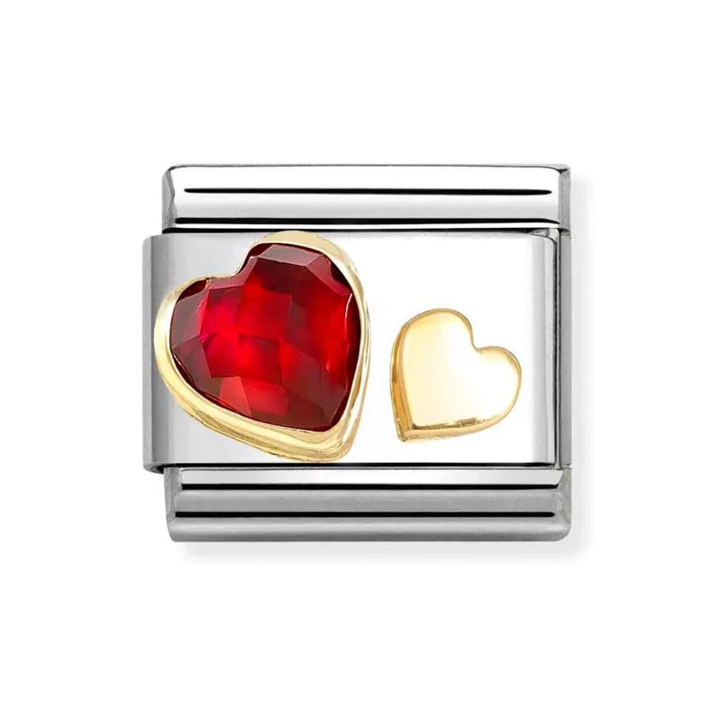 Originele nominatie Classic Link voor Composable armband van roestvrij staal met geel gebonden goud en rode kubische zirkonia-hartsymbolen. De gekleurde kubische zirkonia die in dit item wordt gebruikt, kan zeer lichte kleurvariaties hebben. Gemaakt in Italië. Kies dit paar hartjes om een vleugje liefde en romantiek aan je armband toe te voegen bij een speciale gelegenheid.
