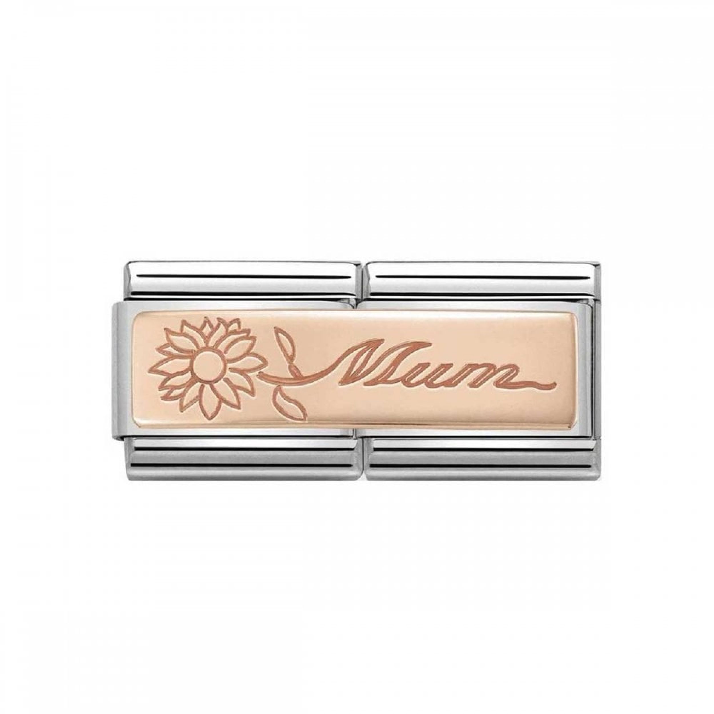 Originele dubbele schakel voor armband met plaquette in gebonden roségoud - MUM met bloem. Gemaakt in Italië. De dubbele link met een kostbare bloem die MAMA laat zien hoe bijzonder ze is.