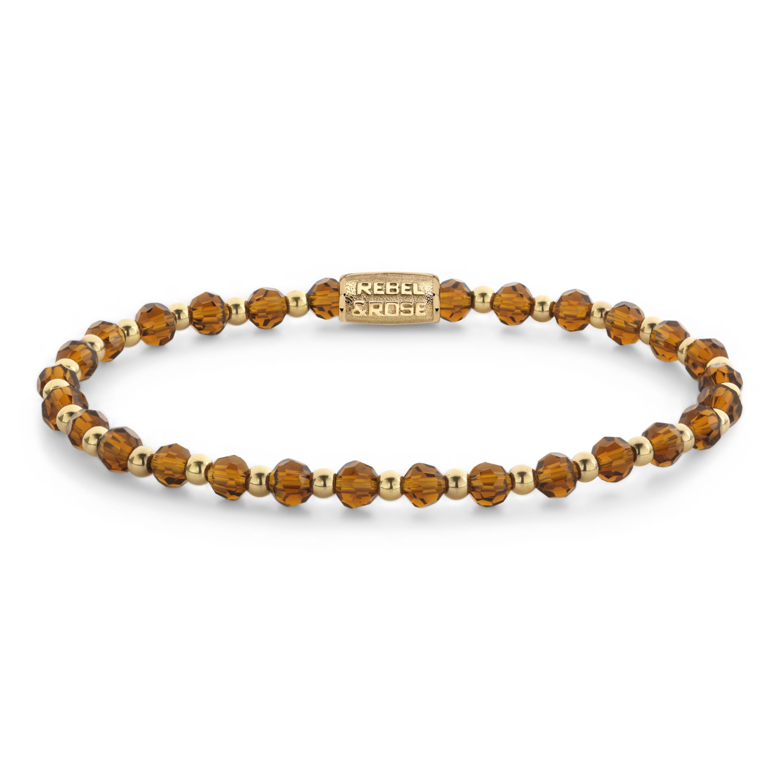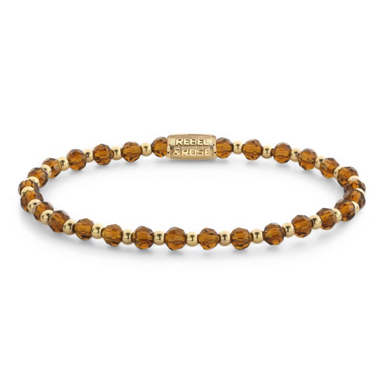 Bead armband, handgemaakt van 4mm stenen (Glas Rock, RVS ion-gold plated) met een 18 karaat goud ion-plated edelstalen sluiting. Het Rebel & Rose sieraad is makkelijk te combineren met onze andere kralenarmbanden.