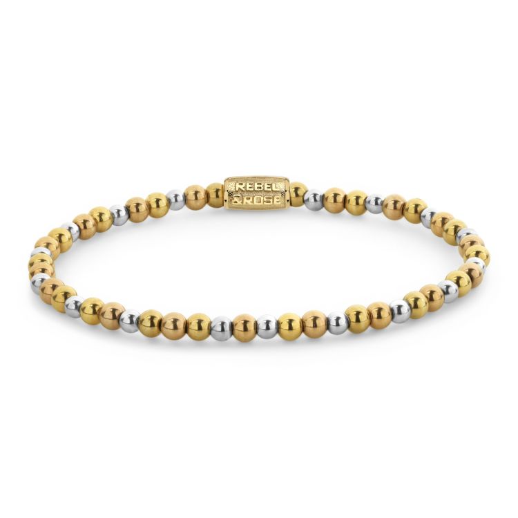 Bead armband, handgemaakt van 3mm edelstalen beads gecomnineerd met 4 mm 18-karaats geelgouden en rosegouden ion-plated edelstalen stenen met een 18-karaats goud ion-plated edelstalen sluiting. Het Rebel & Rose sieraad is makkelijk te combineren met andere zilveren, leren of kralenarmbanden.