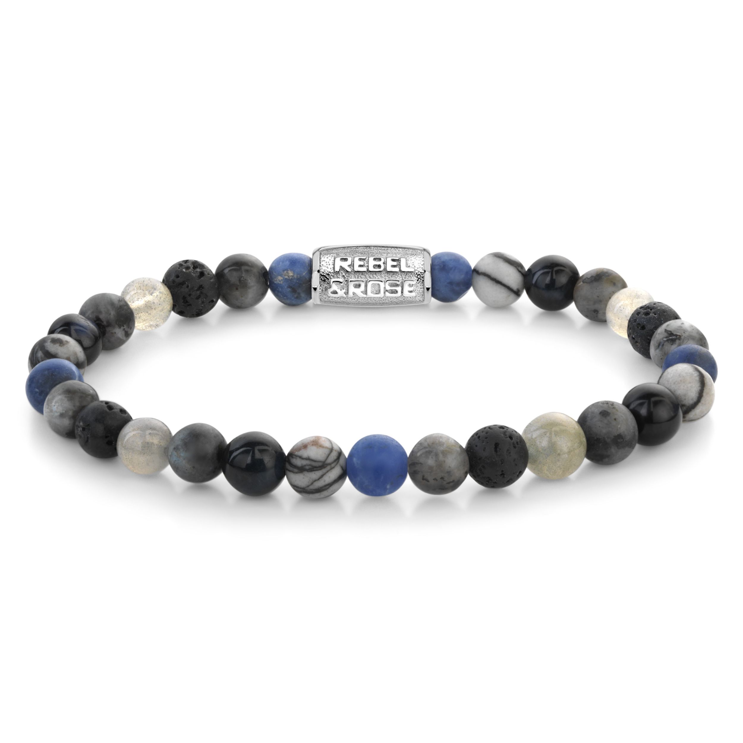 Bead armband, handgemaakt van 6mm Sodaliet Blauw, Agaat (Black Network), Tijgeroog Blauw, Larvakiet Grijs, Labradoriet en Lava stenen met een zilverkleurige sluiting. De Rebel & Rose sieraden zijn makkelijk te combineren met andere zilveren, leren of kralenarmbanden.