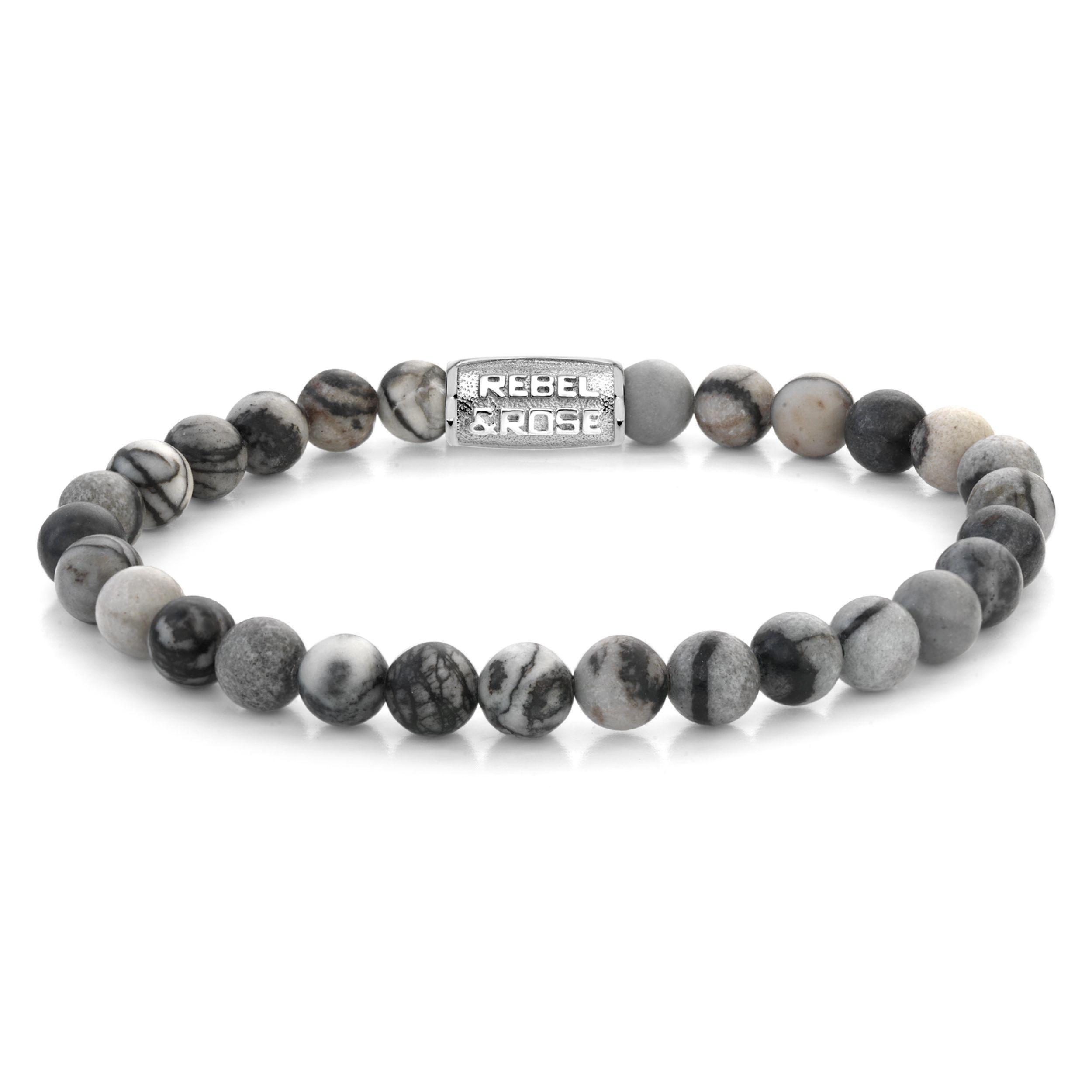 Bead armband, handgemaakt van 6mm Agaat (Black Network) stenen met een zilverkleurige sluiting. Het Rebel & Rose sieraad is makkelijk te combineren met andere zilveren, leren of kralenarmbanden.