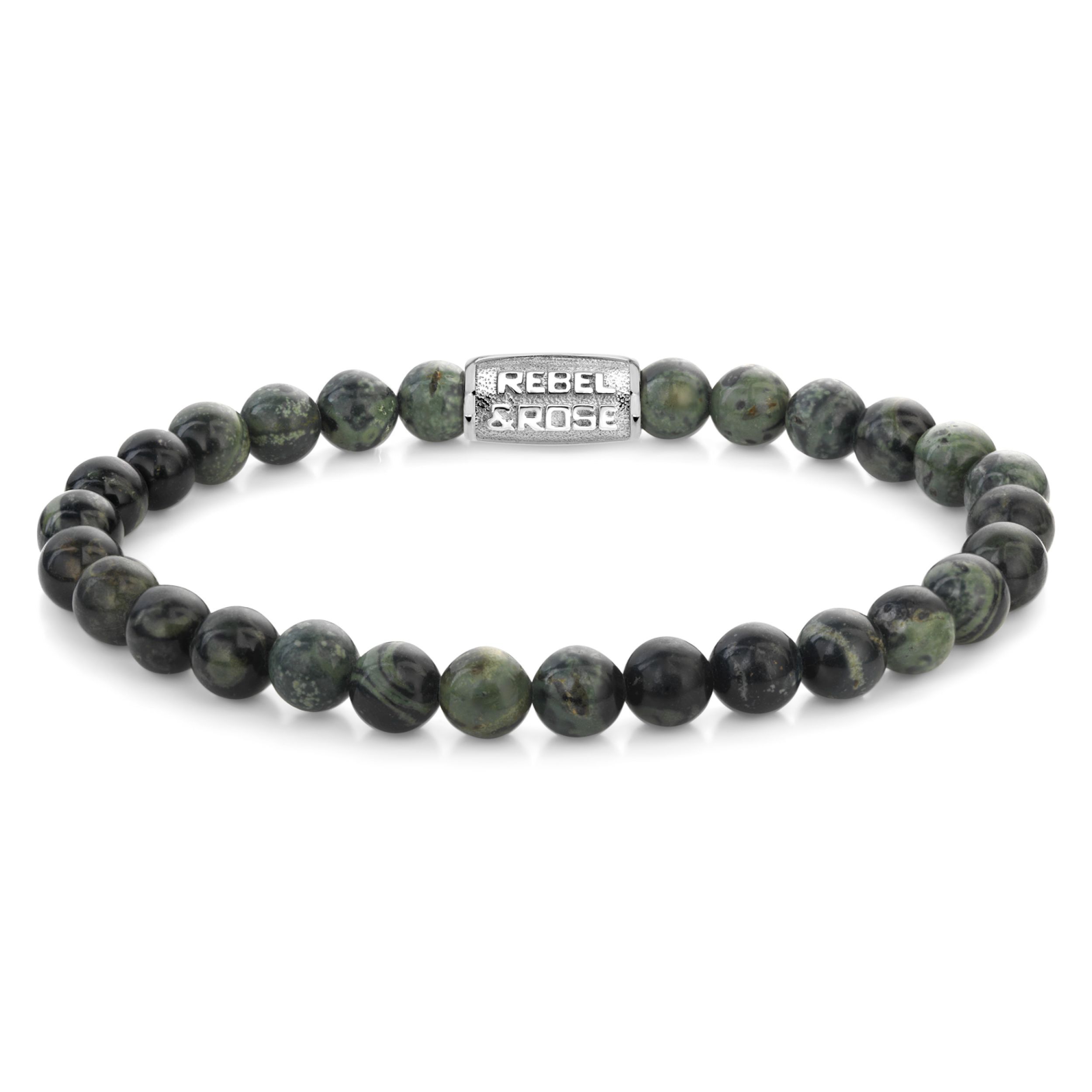 Bead armband, handgemaakt van 6mm Ryoliet stenen met een zilverkleurige sluiting. Het Rebel & Rose sieraad is makkelijk te combineren met andere zilveren, leren of kralenarmbanden.