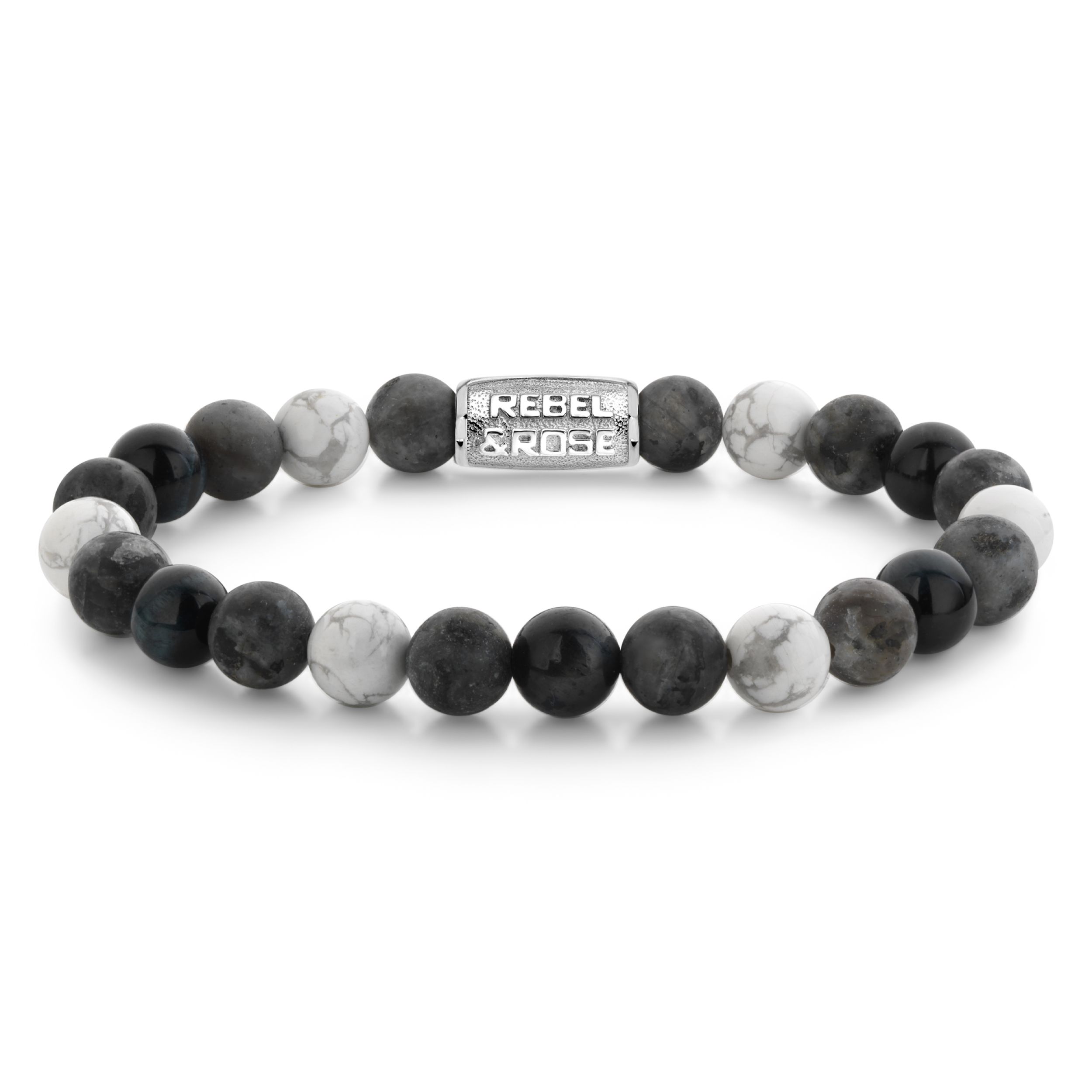 Bead armband, handgemaakt van 8mm stenen (Howliet, Larvakiet, Tijgeroog) met een zilverkleurige sluiting. De Rebel & Rose sieraden zijn makkelijk te combineren met andere zilveren, leren of kralenarmbanden.