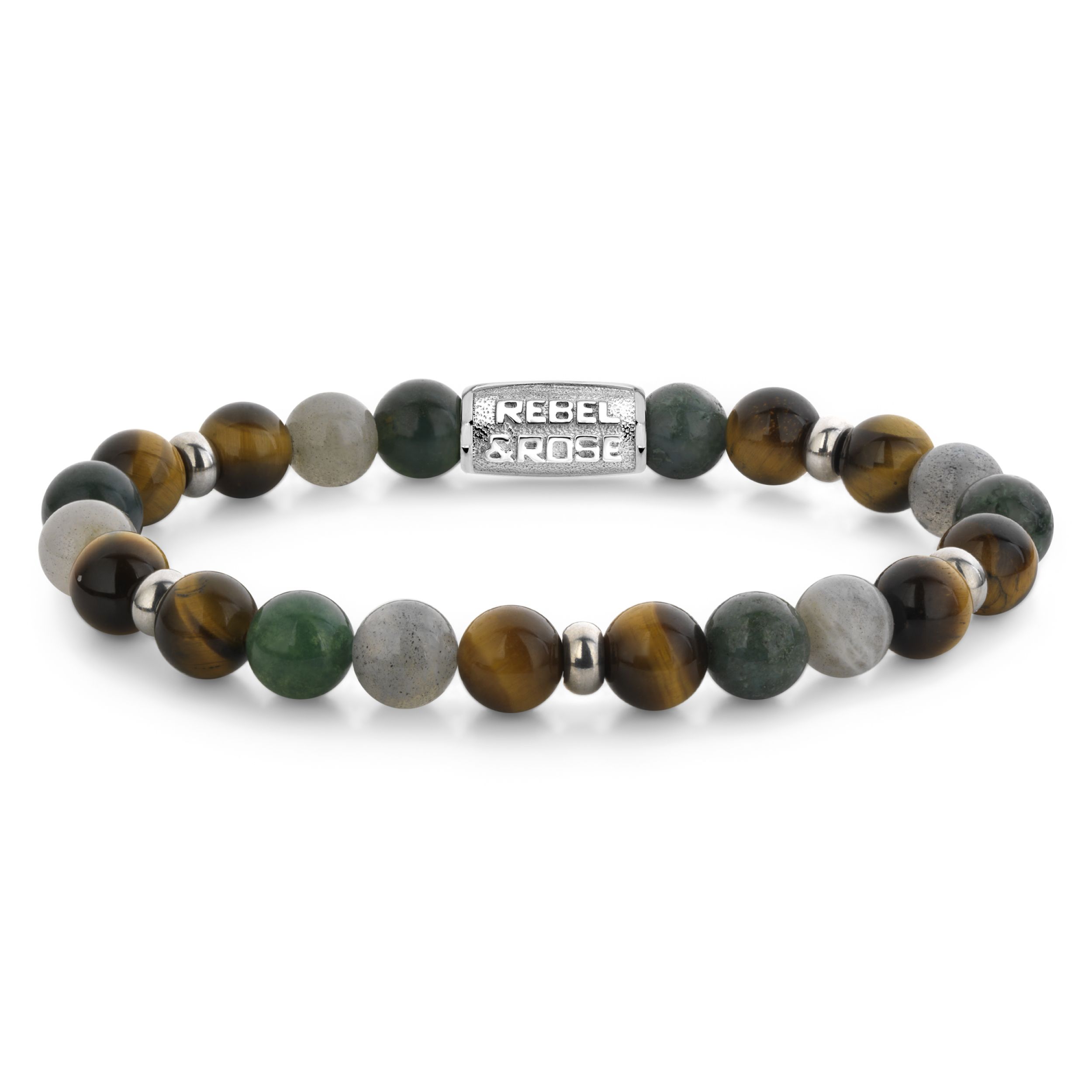 Bead armband, handgemaakt van 8mm stenen (Tijgeroog, Agaat, Labradoriet en kleine Stainless Steel elementen) met een zilverkleurige sluiting. De Rebel & Rose sieraden zijn makkelijk te combineren met andere zilveren, leren of kralenarmbanden.