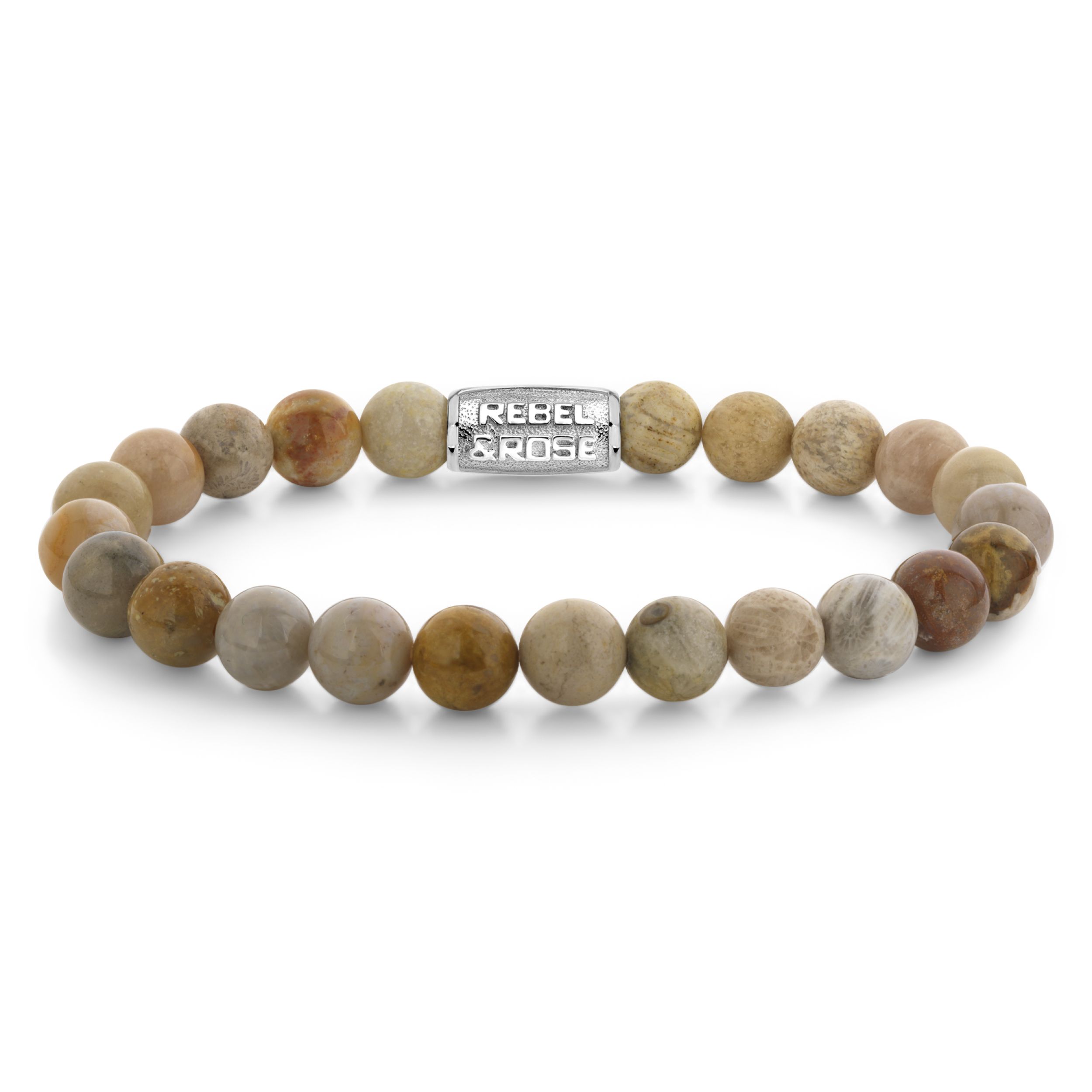 Bead armband, handgemaakt van 8mm Agaat stenen met een edelstalen sluiting.Het Rebel & Rose sieraad is makkelijk te combineren met andere zilveren, leren of kralenarmbanden.