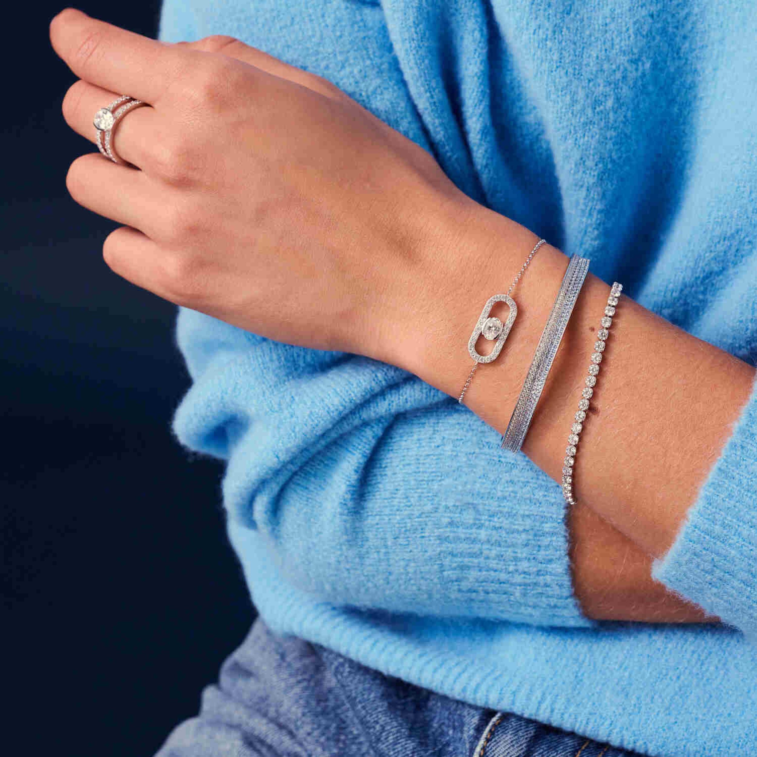Armband gemaakt van 925 sterling zilver met rhodium, gepolijst oppervlak en bezet met gefacetteerde witte kubieke zirkonia.