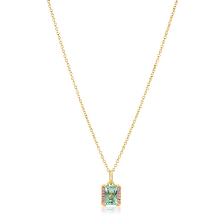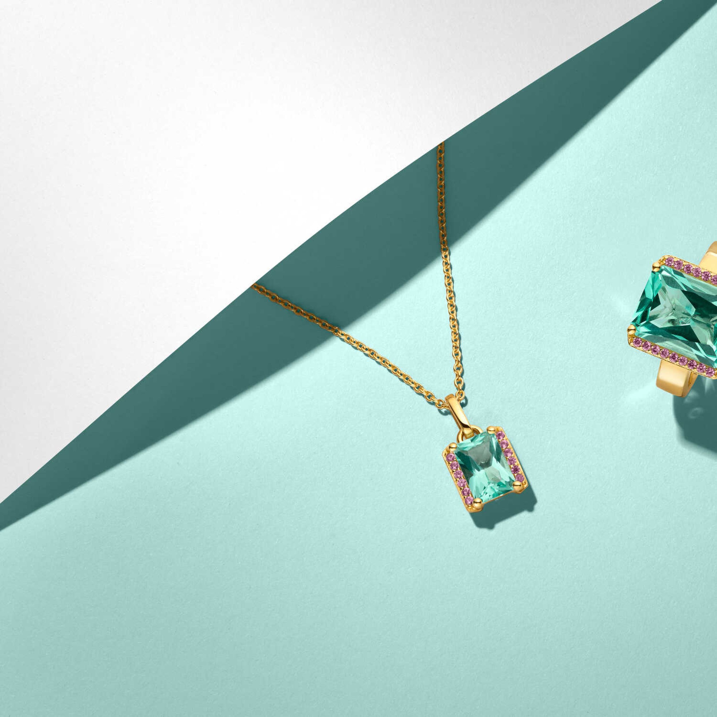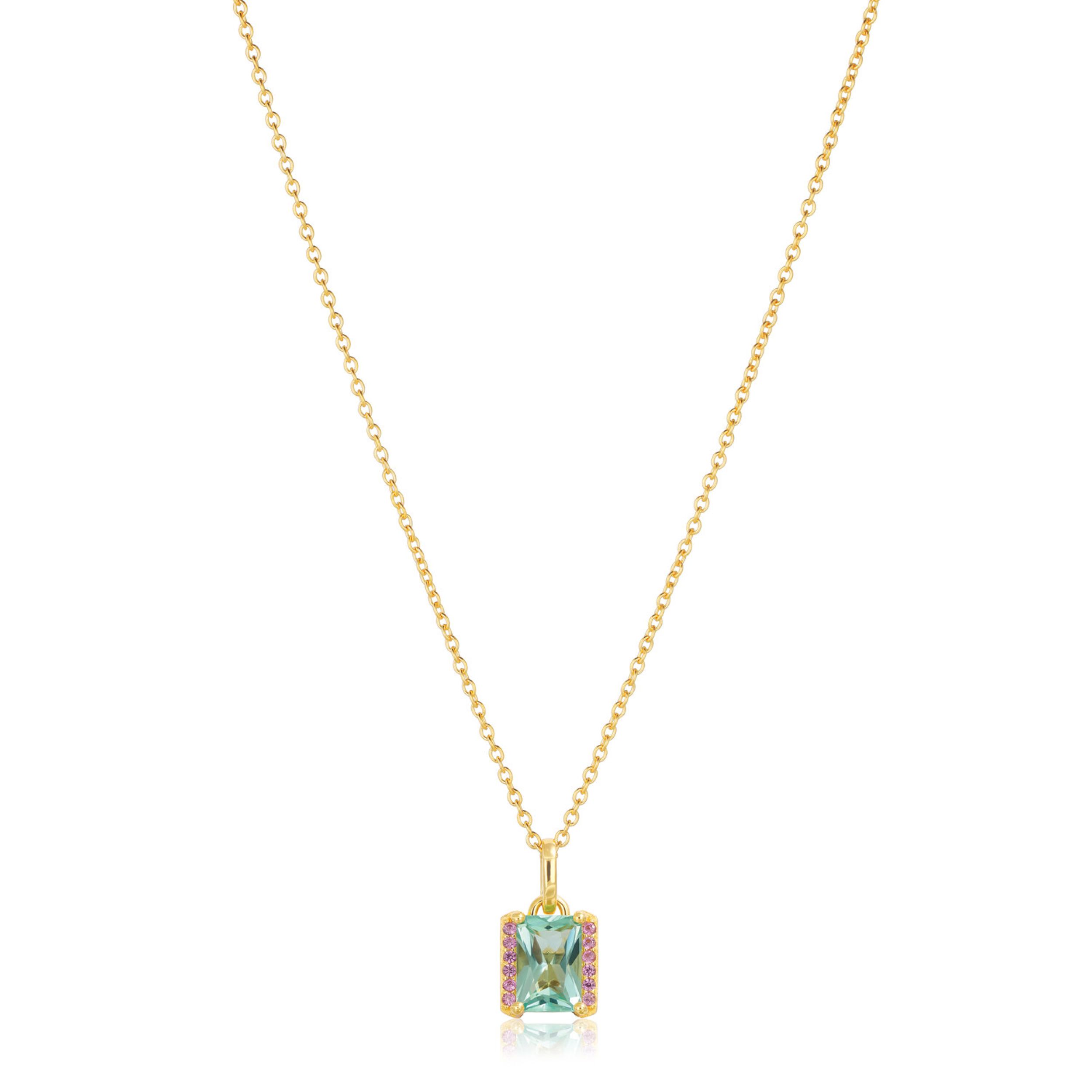 Ketting gemaakt van 18 karaats verguld geplateerd 925 sterling zilver, gepolijst ondergrond, met roze facet-snede en turquoise baguette zirkonia. De talisman is afneembaar.