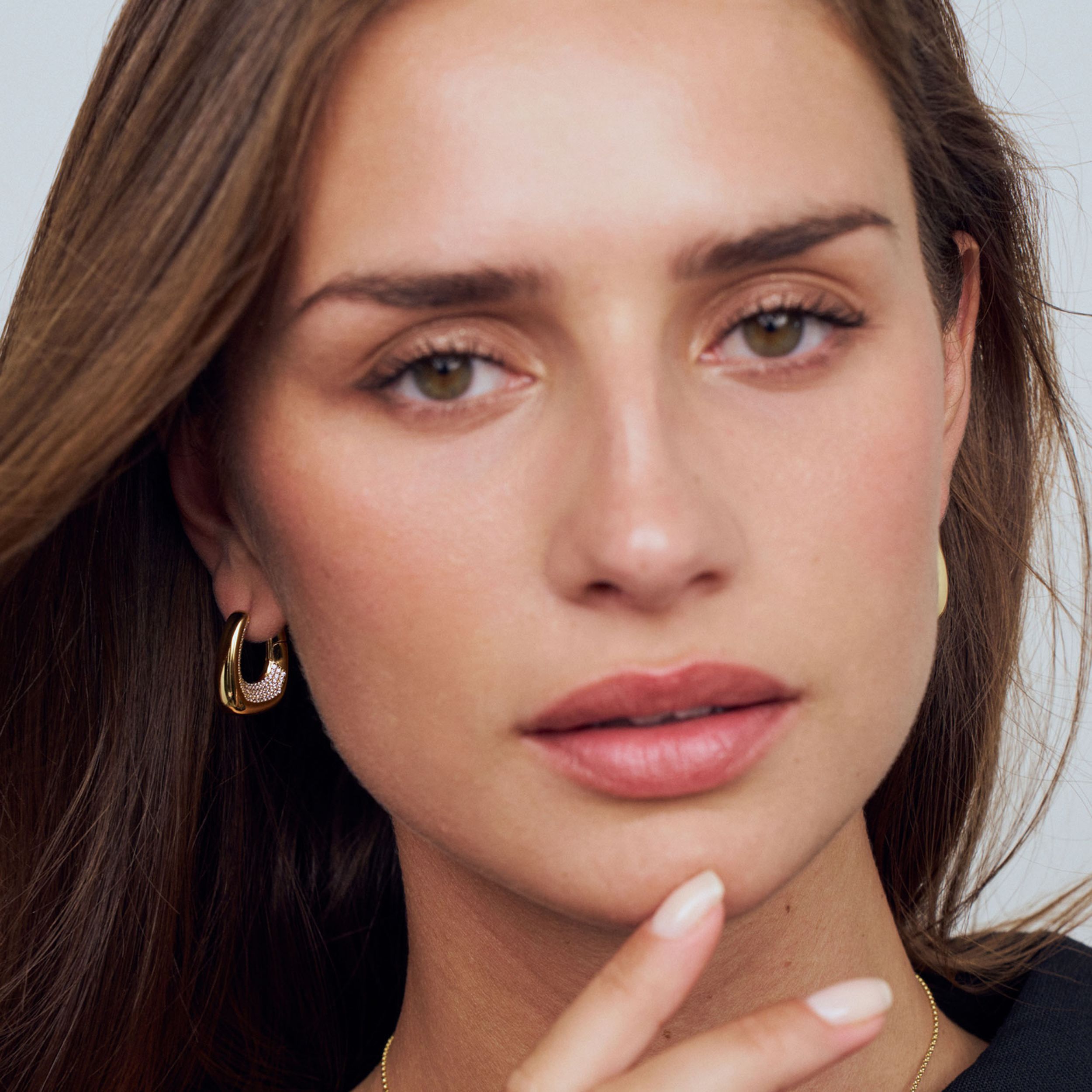 Oorbellen gemaakt van 18k verguld 925 sterling zilver, een gepolijst oppervlak en handset met facet geslepen witte zirkonia.