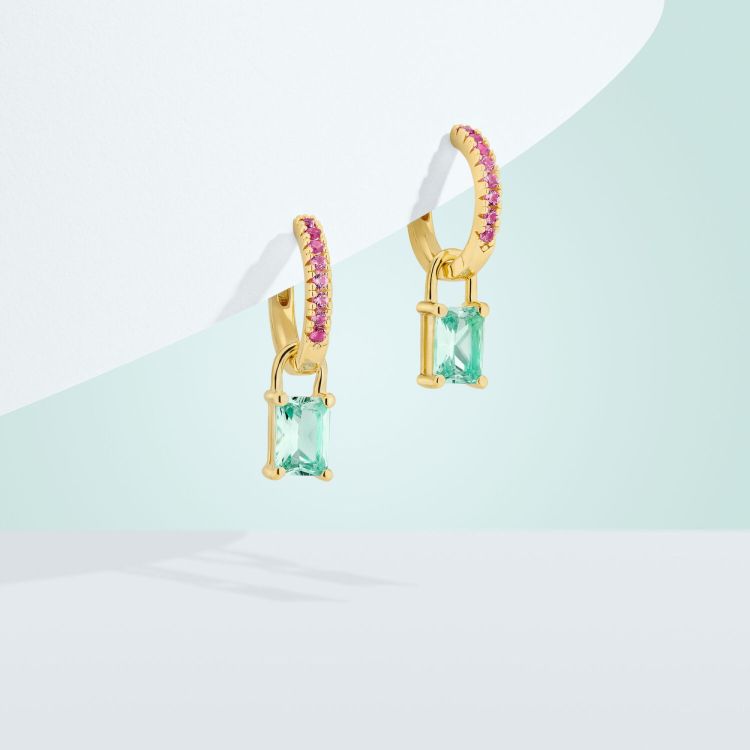 Oorbellen gemaakt van 18 karaats verguld geplateerd 925 sterling zilver, gepolijst ondergrond, met roze facet-slijpvorm en turquoise baguette zirkonia. De talisman is afneembaar.