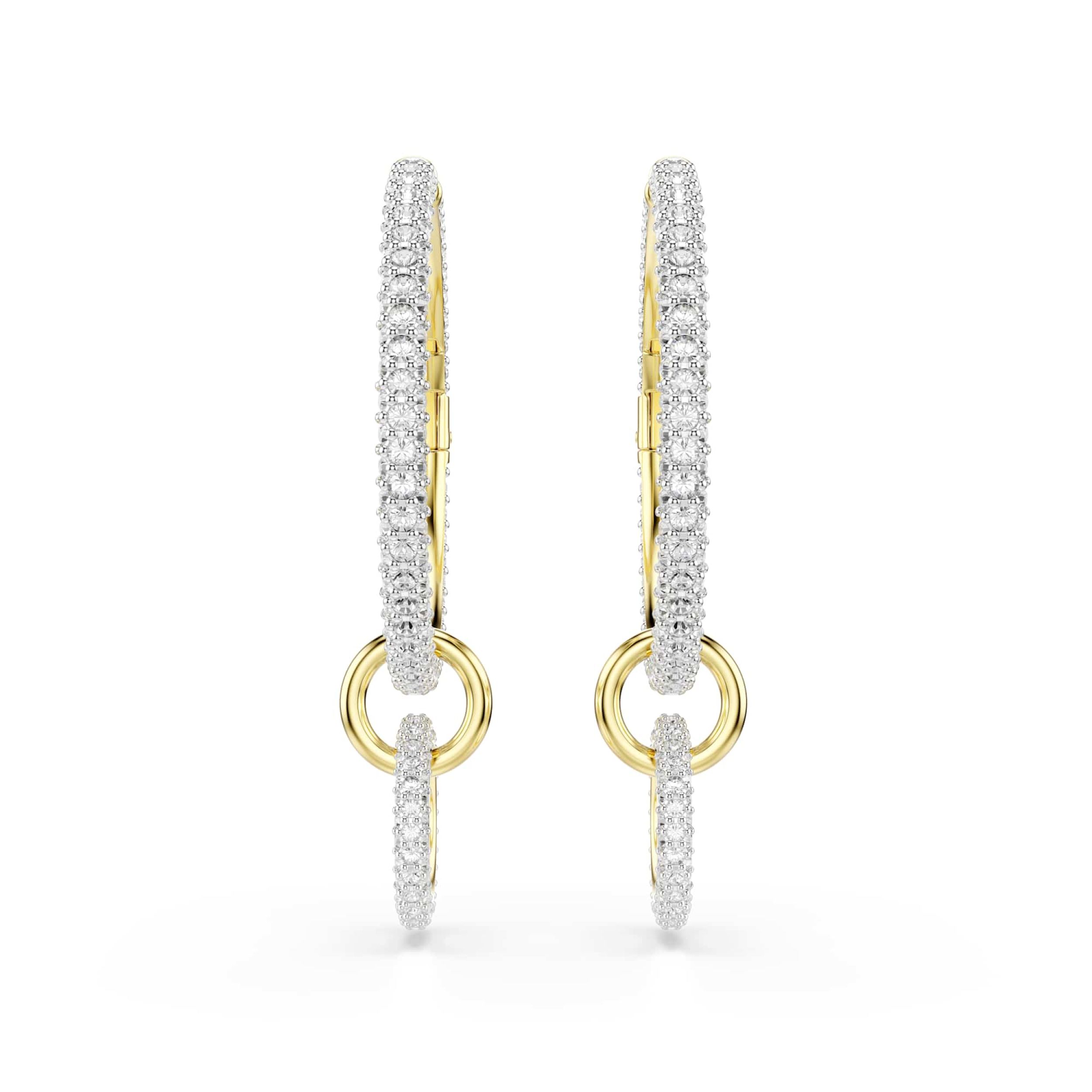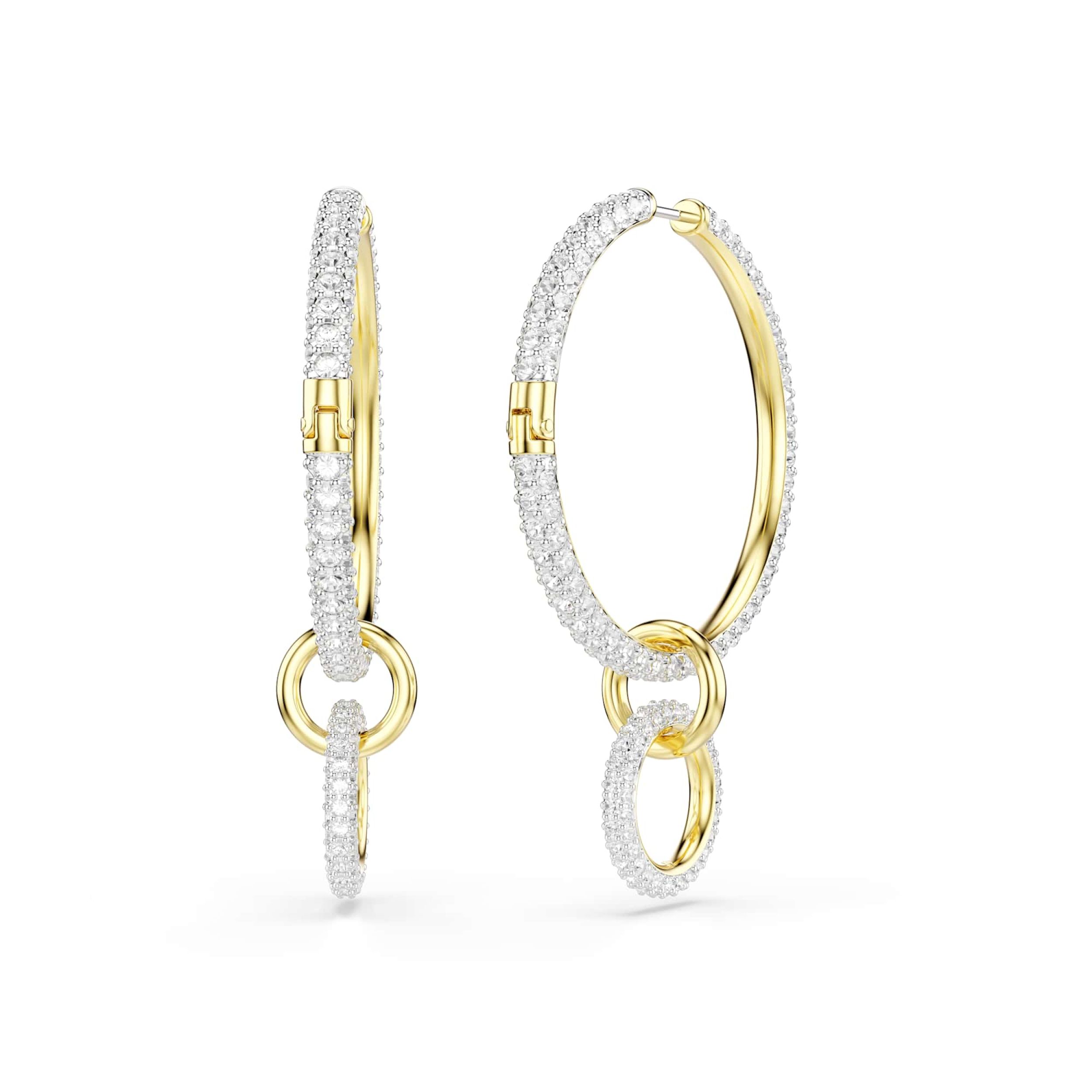 Geef je dagelijkse looks een boost van schittering met deze verfijnde hoepeloorbellen. Gemaakt met drie met elkaar verbonden ringen, is elke oorbel goudkleurig geplateerd en voorzien van stralende heldere kristallen. Voor een veelzijdige stylingoptie kan het hanggedeelte eenvoudig worden verwijderd, waardoor je het uiterlijk gemakkelijk kunt aanpassen.