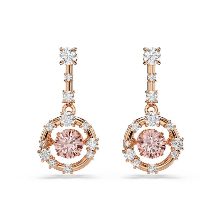 Gemaakt voor maximale uitstraling, laten deze met sterren geïnspireerde oorbellen elke outfit stralen. Elk roségoudkleurig geplateerd stuk heeft een roze dansende steen in het midden, die eindeloze reflecties veroorzaakt, terwijl kleinere Swarovski Zirconia rond de metalen lijsten en staven zijn geplaatst. Draag ze met de bijpassende hanger om je stijl de kosmos in te lanceren.