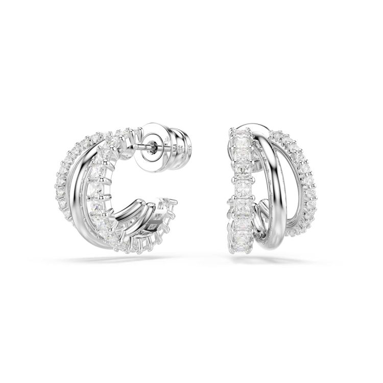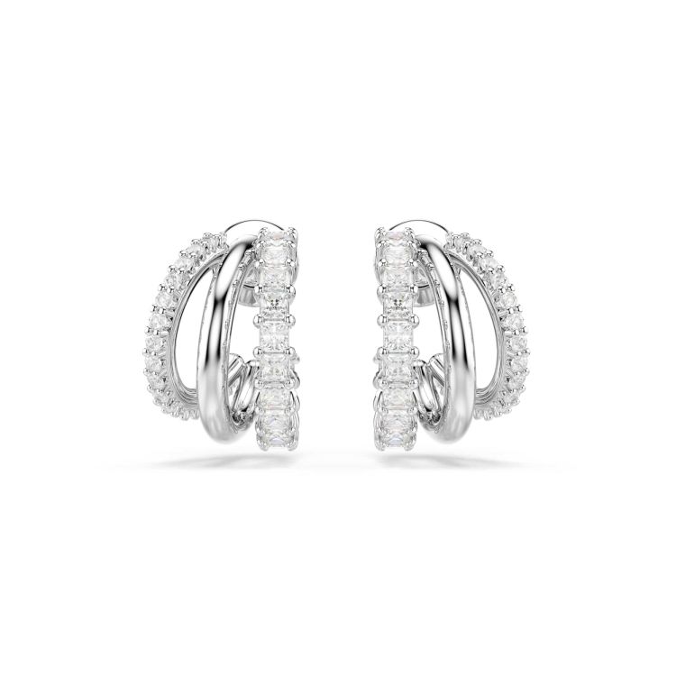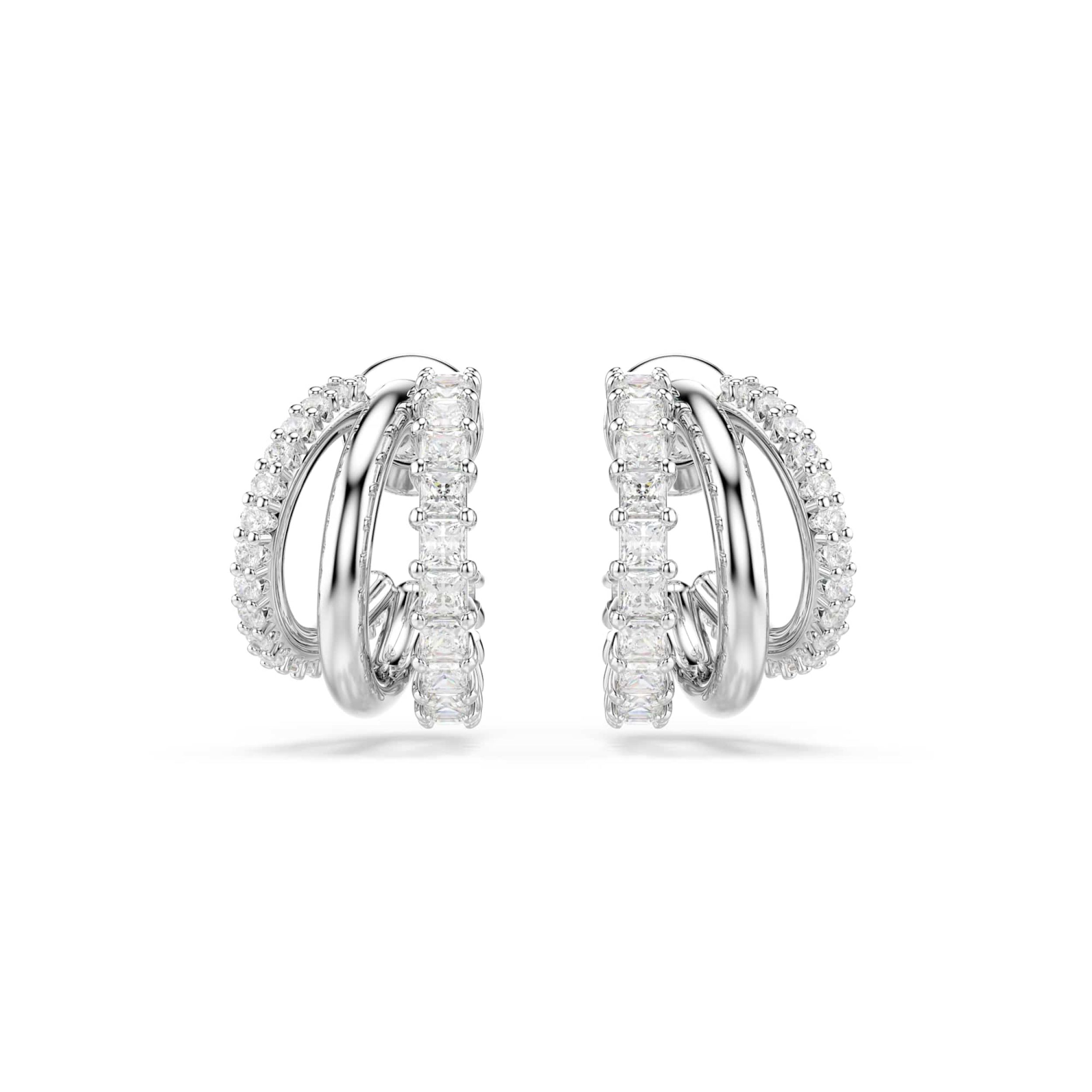 Deze ingewikkeld vervaardigde Hyperbola-oorbellen tonen een unieke schoonheid. Aan elke zijde zijn de drie mini-ringen gepresenteerd in rhodiumplaten, met een versiering van ronde en vierkante gesneden Swarovski Zirconia in een klauwzetting. Stijl met een bijpassende armband of hanger voor een showstopper-look.
