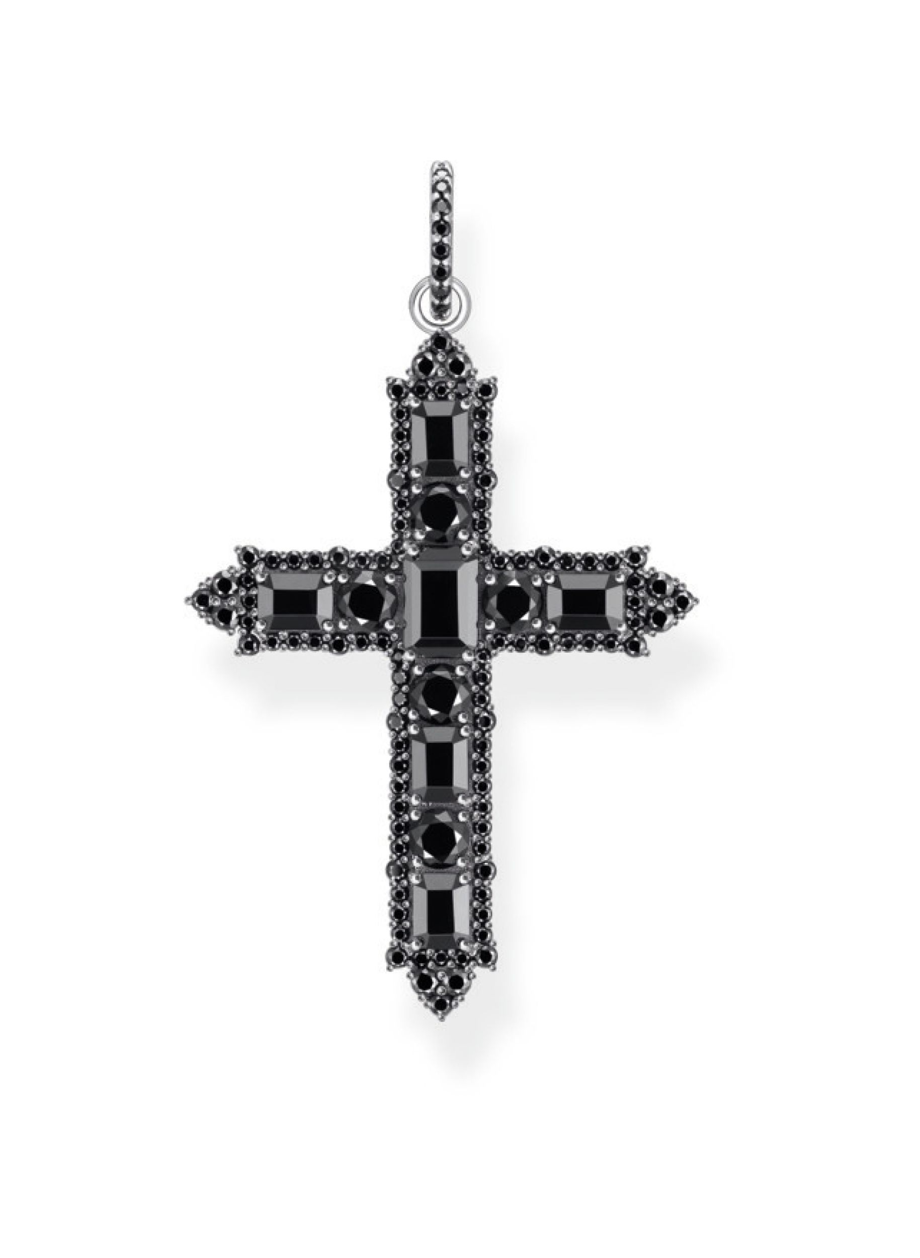 In de vorm van een tijdloos kruis met zwarte zirkonia stenen met een ronde en achthoekige slijpvorm, evenals een rand die fijn is versierd met zwarte zirkonia pavé
