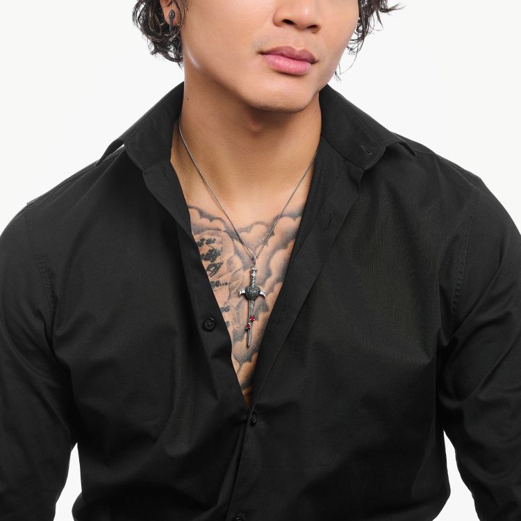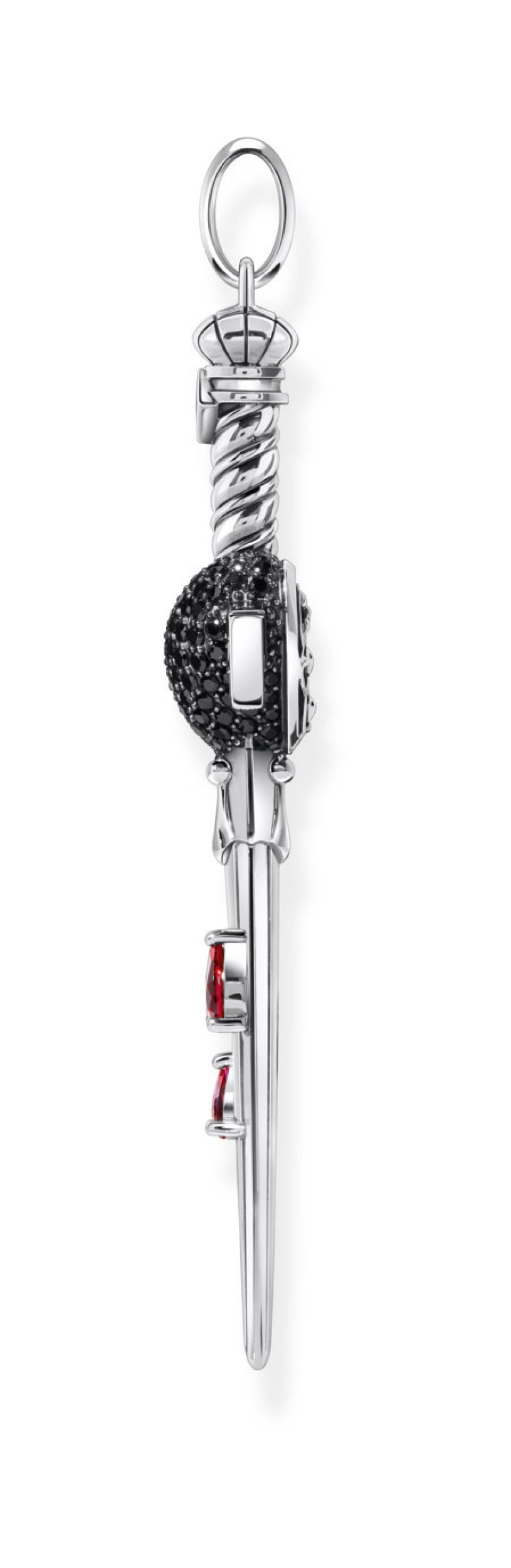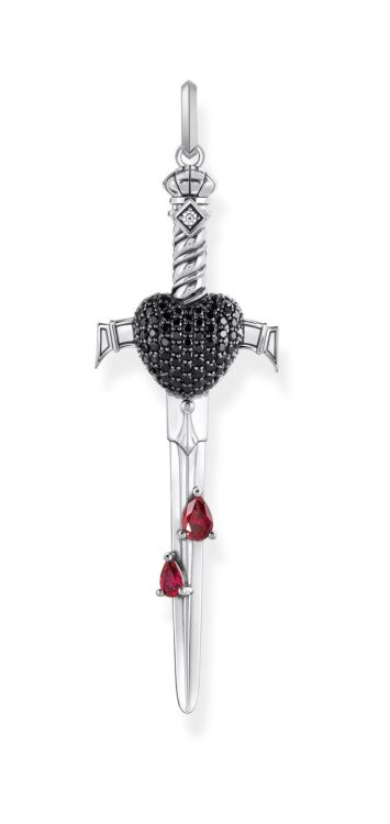 Draag dit oude symbool als talisman en als weerspiegeling van je eigen verhaal. Het zwaard staat voor macht, vrijheid en rechtvaardigheid. Deze uitbundig ontworpen hanger van gerecycled, gezwart zilver weerspiegelt al die betekenissen. Een sprankelende witte zirkonia steen, fijne gegraveerde lijnen en een hart dat is verfraaid met zwarte zirkonia stenen, maar ook gedraaide designelementen, uitsparingen aan de achterkant en twee rode druppelvormige stenen sieren het prachtig. Combineer het met elke ketting uit ons THOMAS SABO-assortiment.